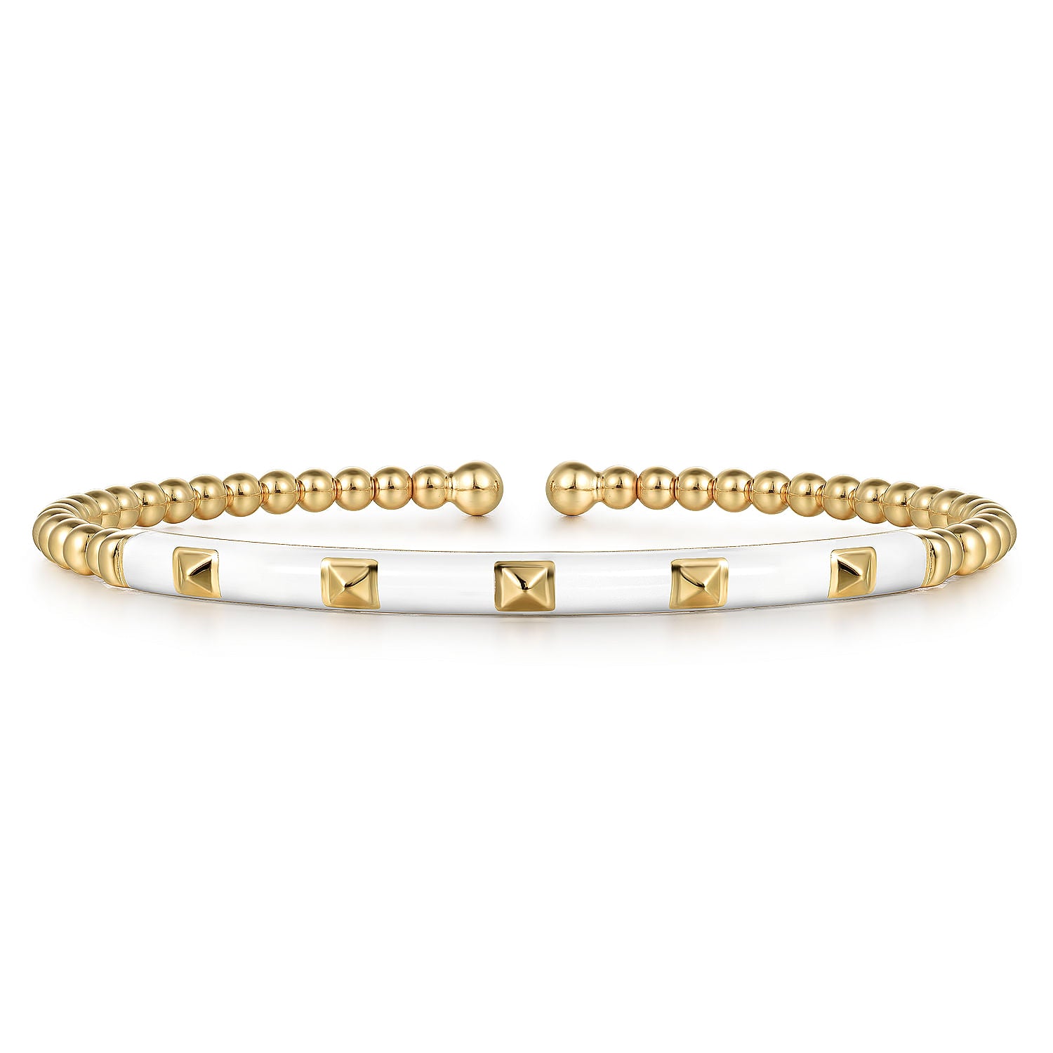 14K Yellow Gold Bujukan Beads and Pyramid Split Bangle with White Enamel