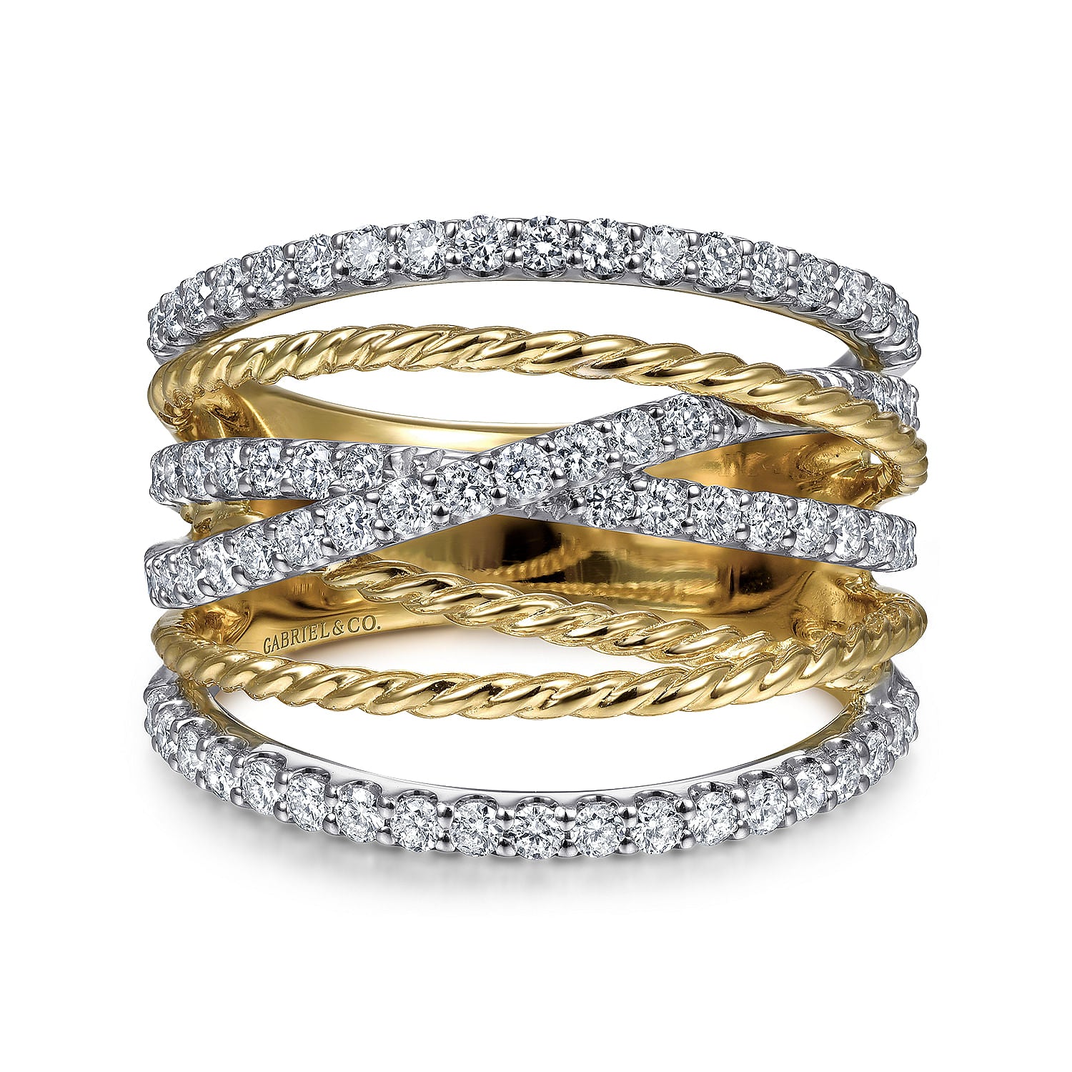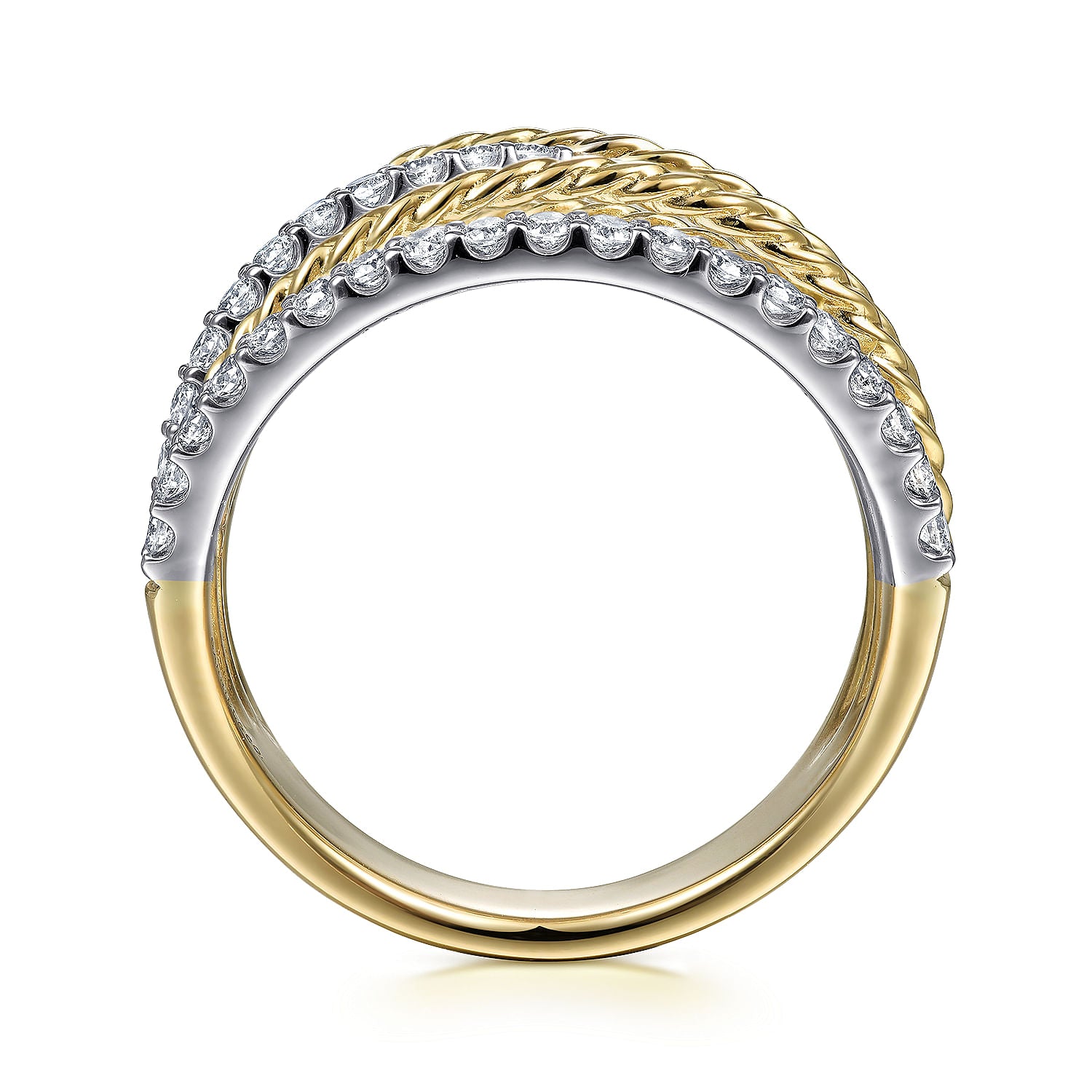 14K White-Yellow Gold Twisted Rope and Diamond Multi Row Ring