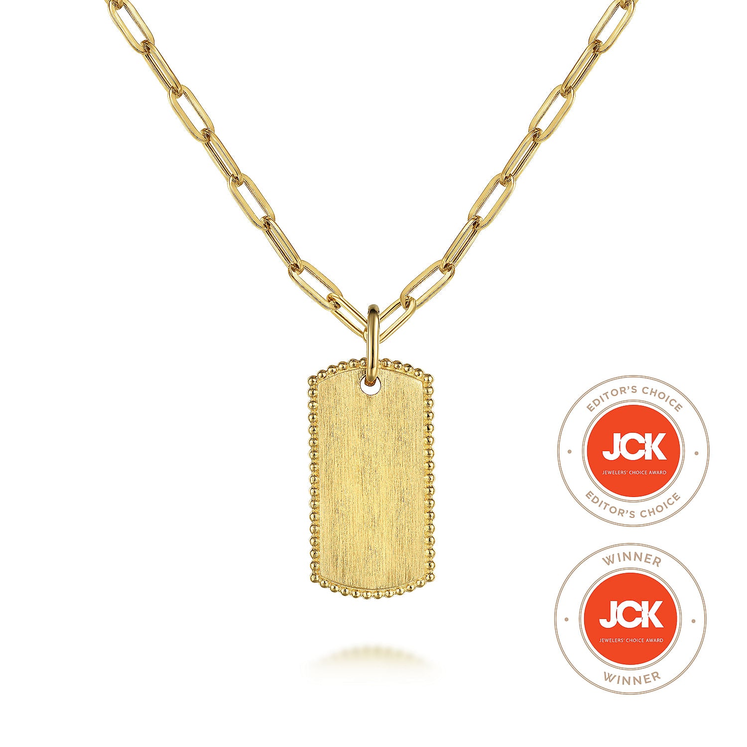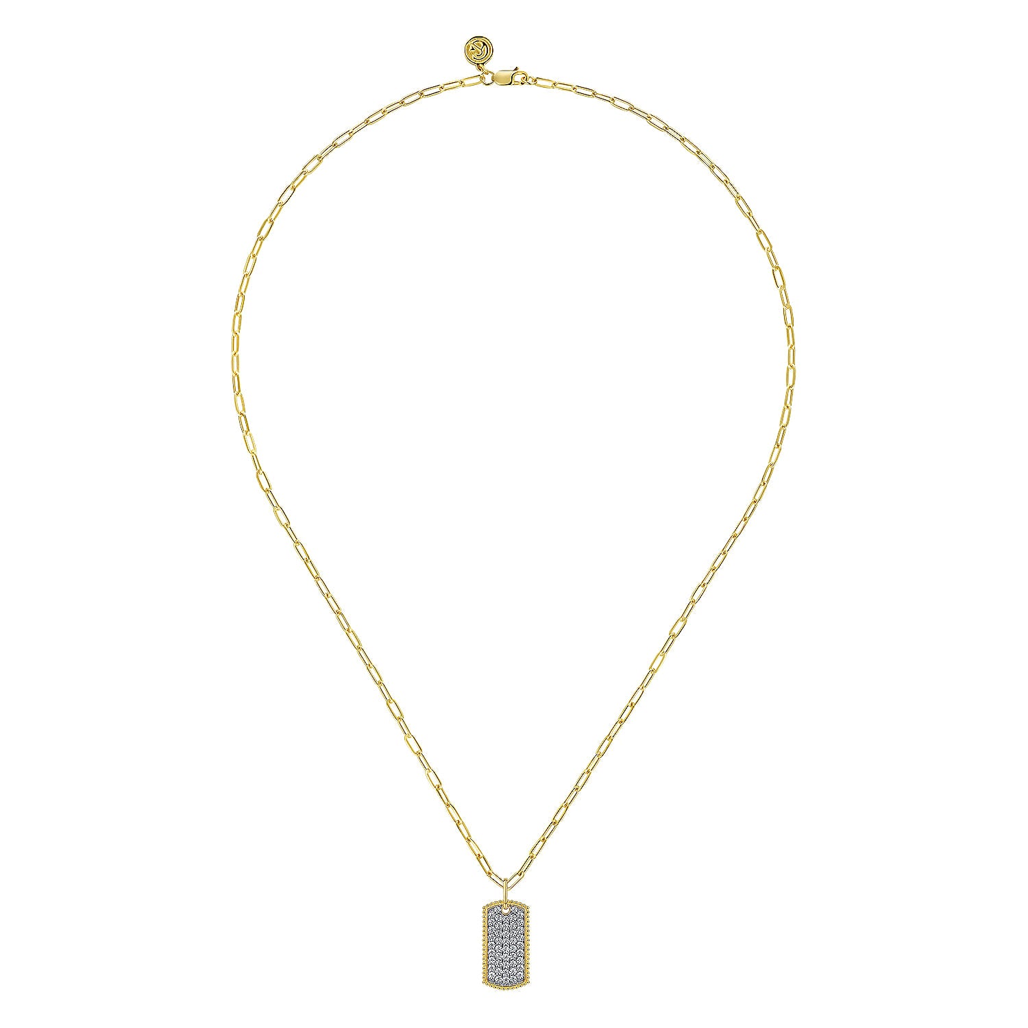 14K Yellow Gold Diamond Pavé Dog Tag Pendant Hollow Chain Necklace