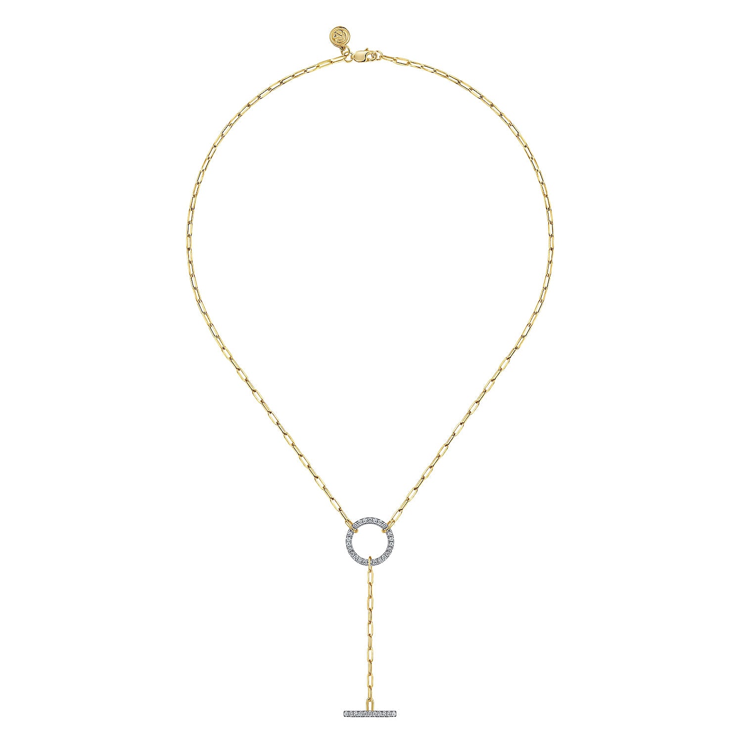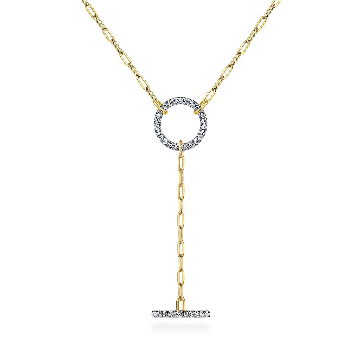 14K Yellow Gold Diamond Circle and Bar Y-Knot Necklace with Hollow Paperclip Chain