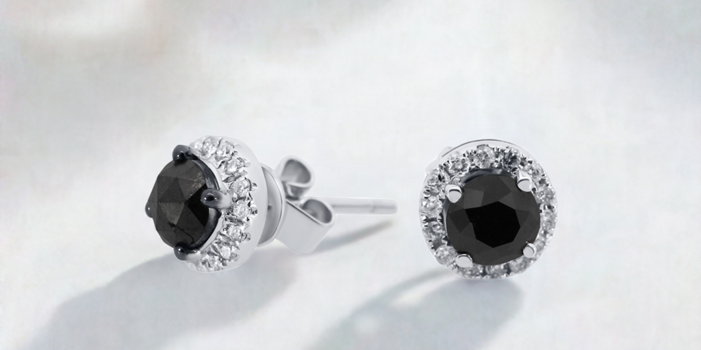 Black Diamond Stud Earrings in 14K White Gold with Diamond Halo