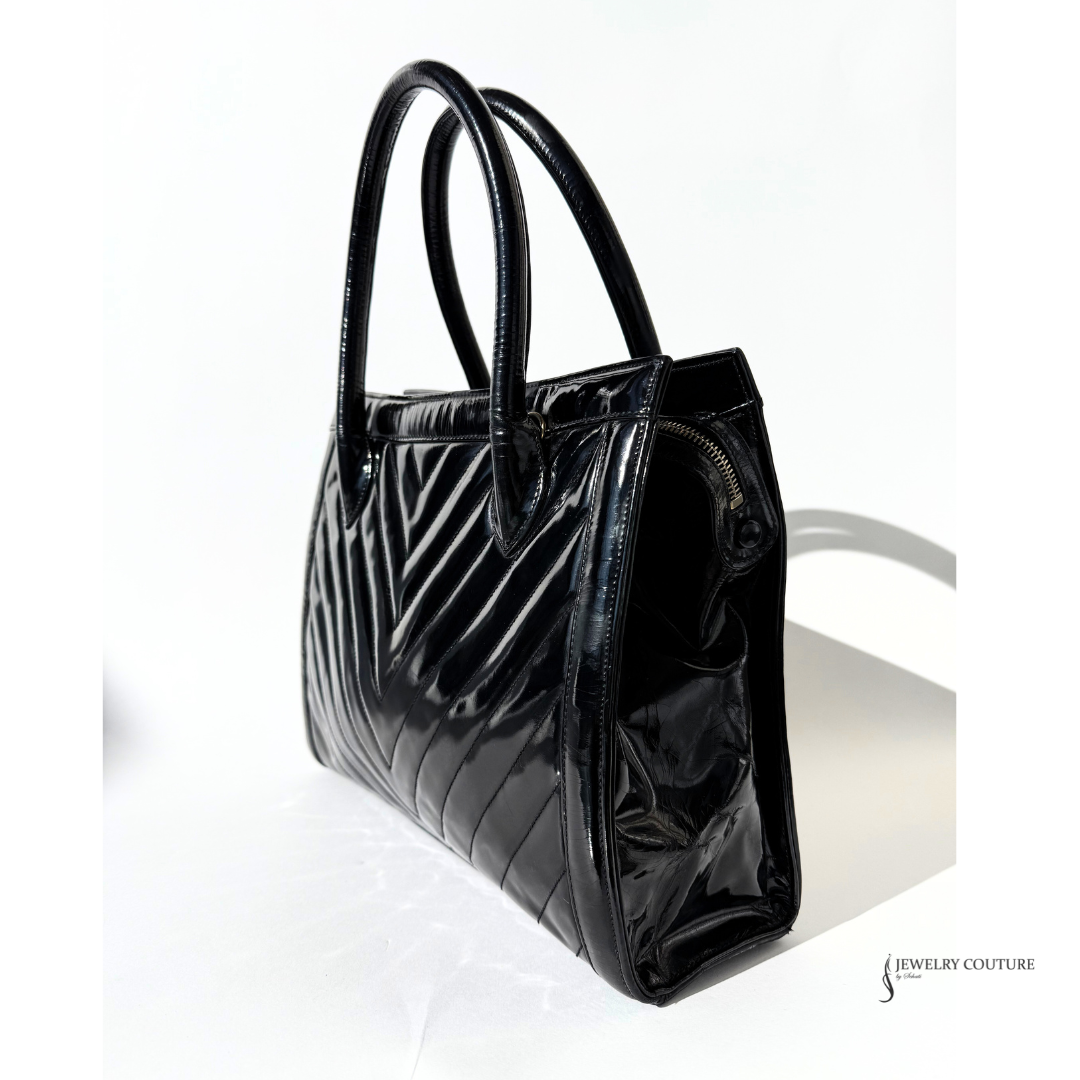 Chanel Quilted Chevron 2way Tote Black Patent Leather Shoulder Bag Timeless classique top handle Pre-Loved