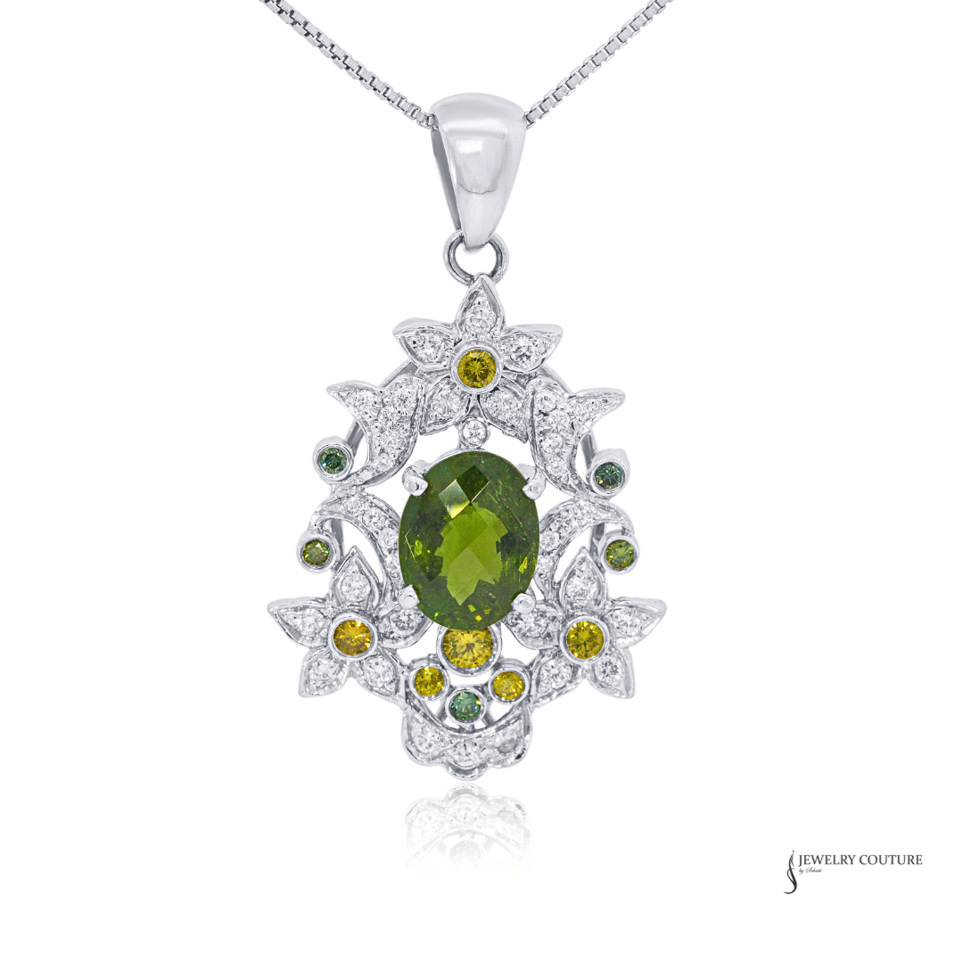14K White Gold Green Tourmaline & Multi-Gemstone Pendant | Oval Tourmaline | Statement Floral Design