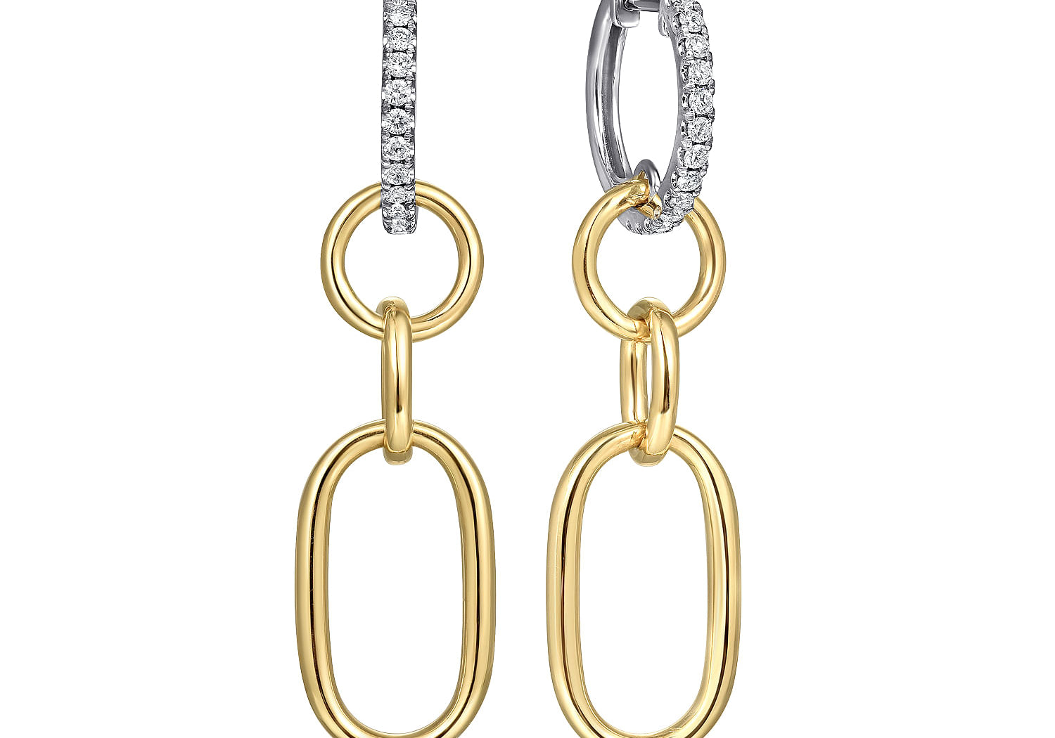 14K White and Yellow Gold Diamond Hollow Tube Huggie Drop Earrings