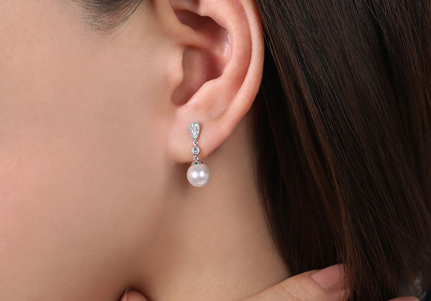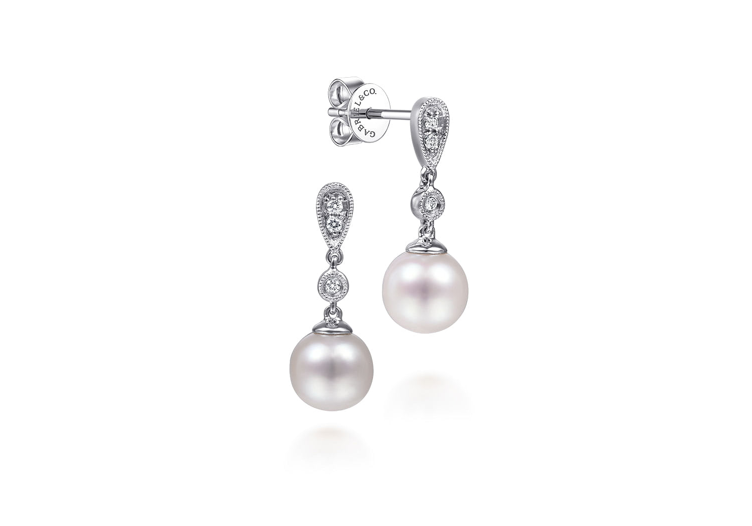 14K White Gold Vintage Inspired Style Diamond Pearl Drop Earrings