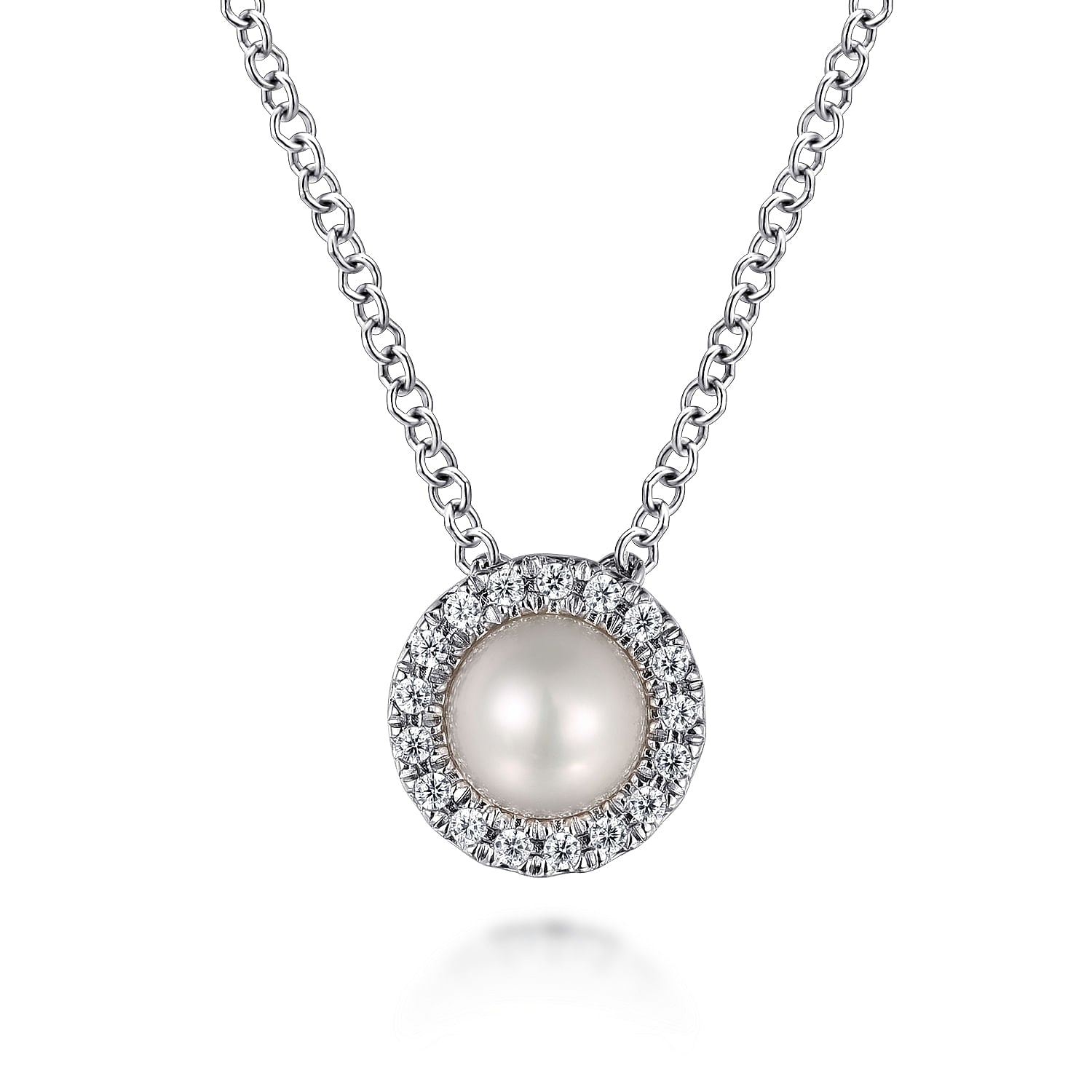 14K White Gold Pearl and Diamond Halo Pendant Necklace
