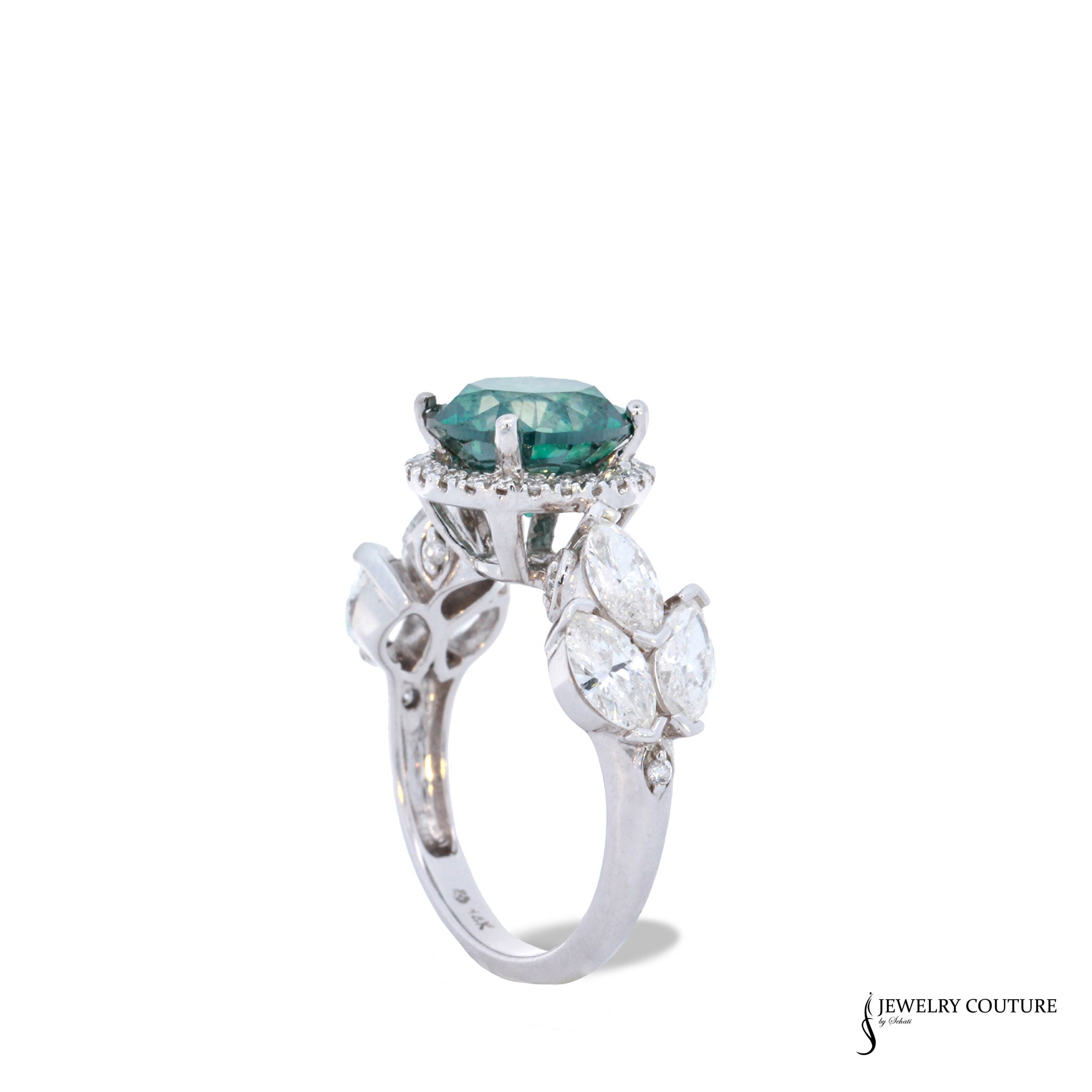 14KT White Gold Blue-Green Round Diamond Center Halo Ring with Marquise Sides