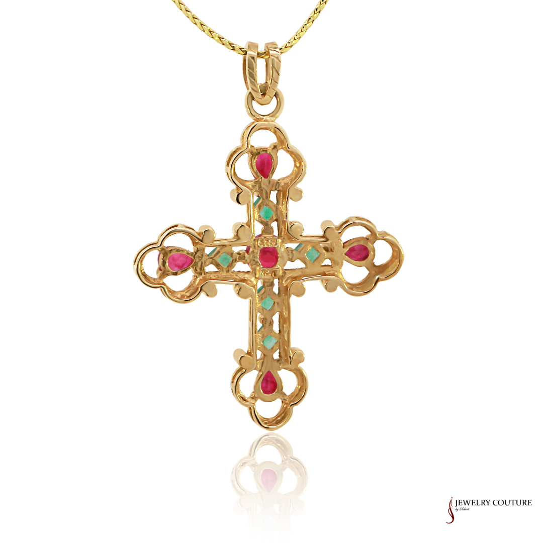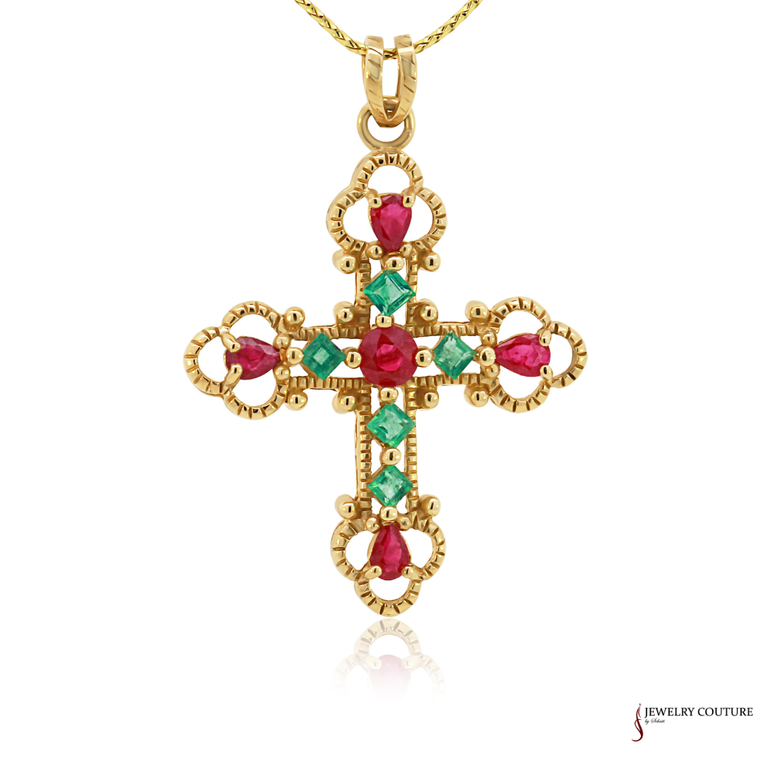 Celebrate your faith with this exquisite 10K gold cross pendant, featuring vibrant rubies and emeralds in a stunning design. Meticulously crafted, this pendant combines the timeless beauty of fine gemstones with the profound symbolism of the cross. Perfect for special occasions, religious ceremonies, or as a thoughtful gift for a loved one.