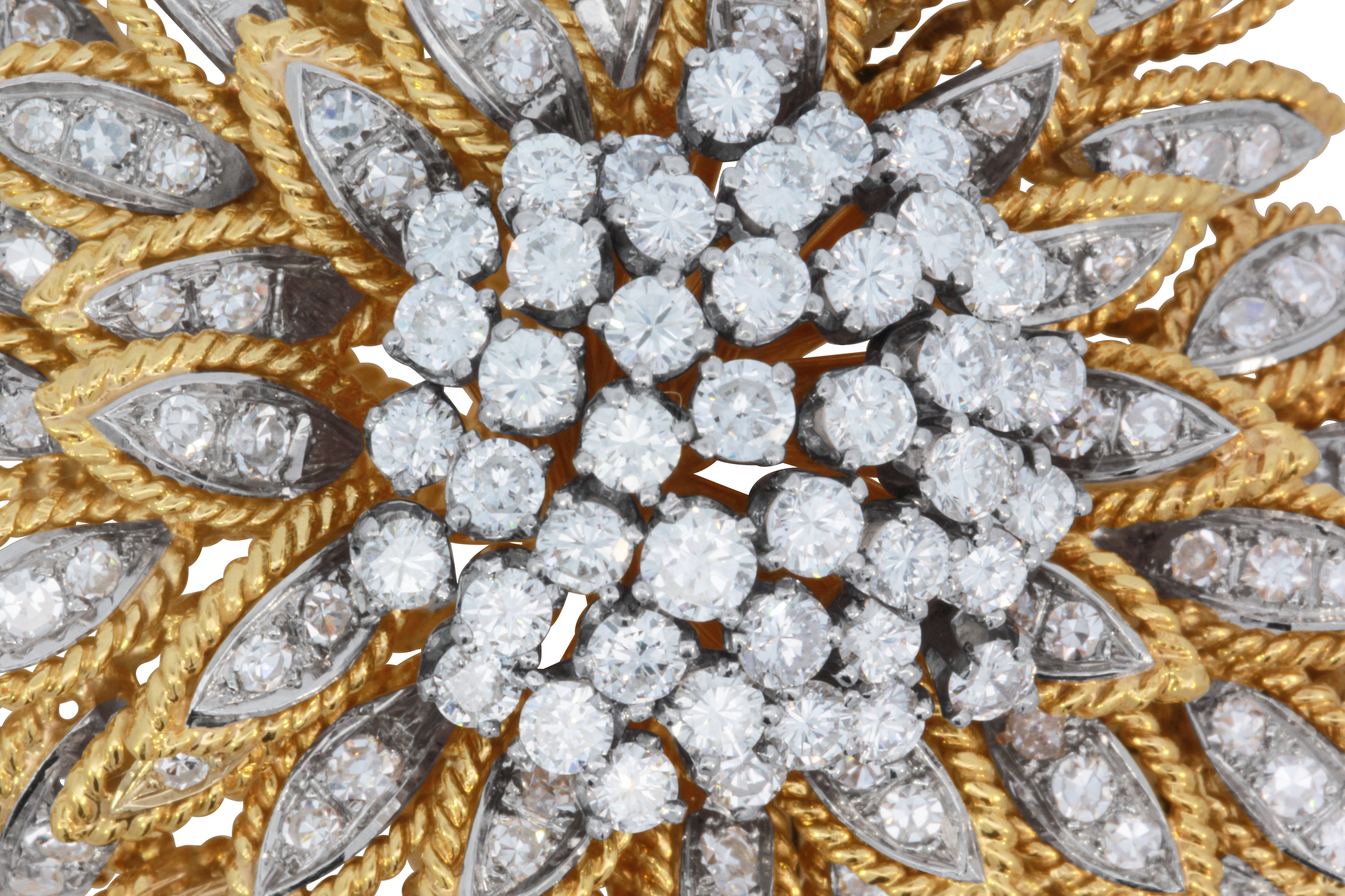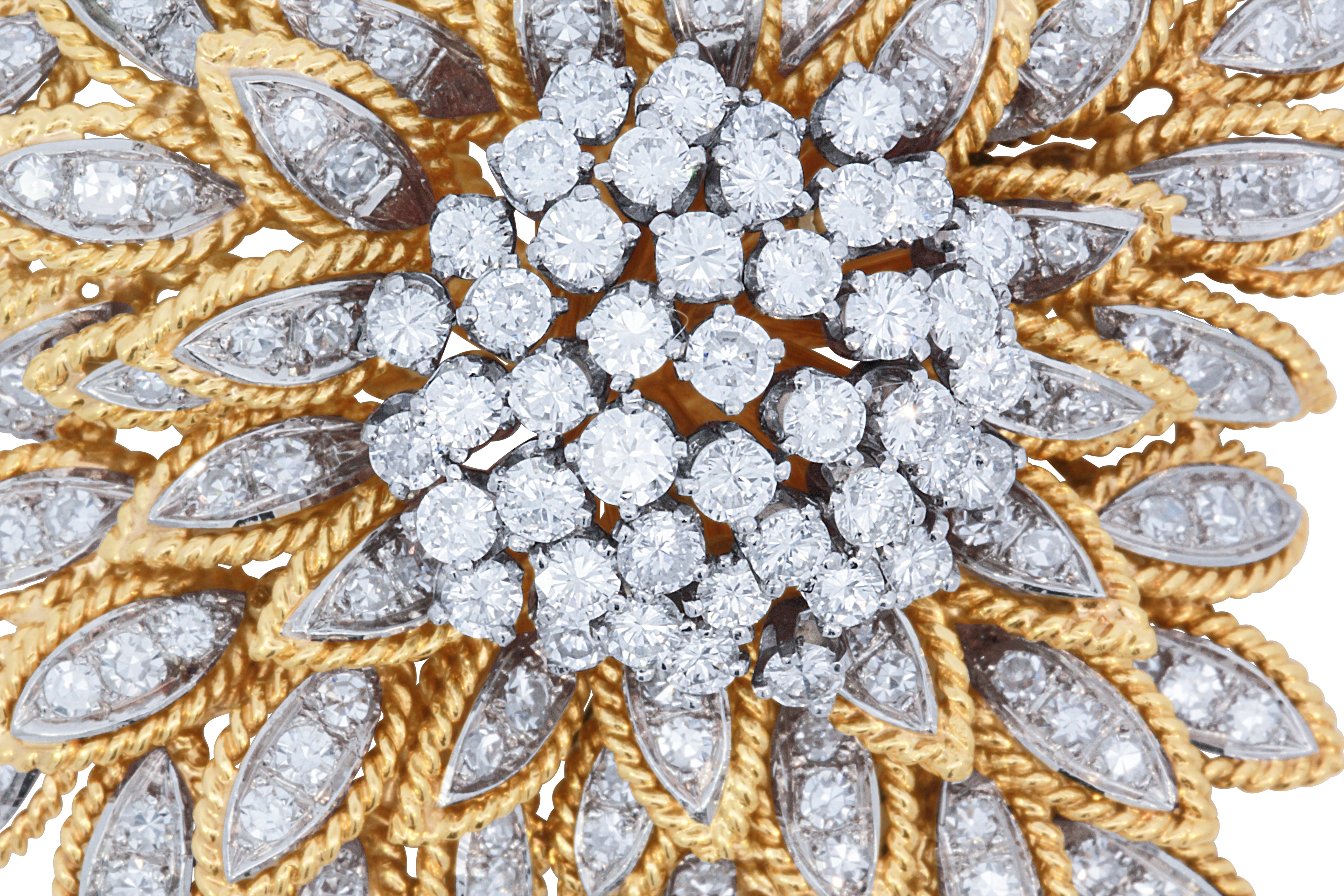 Exquisite 14K two-tone gold vintage brooch and pendant, a versatile and collectible piece of estate fine jewelry. Measuring 2 1/8 inches, this timeless design is set with an impressive 5.54 carat total weight of brilliant diamonds, arranged in a dazzling floral motif that radiates elegance and sophistication.