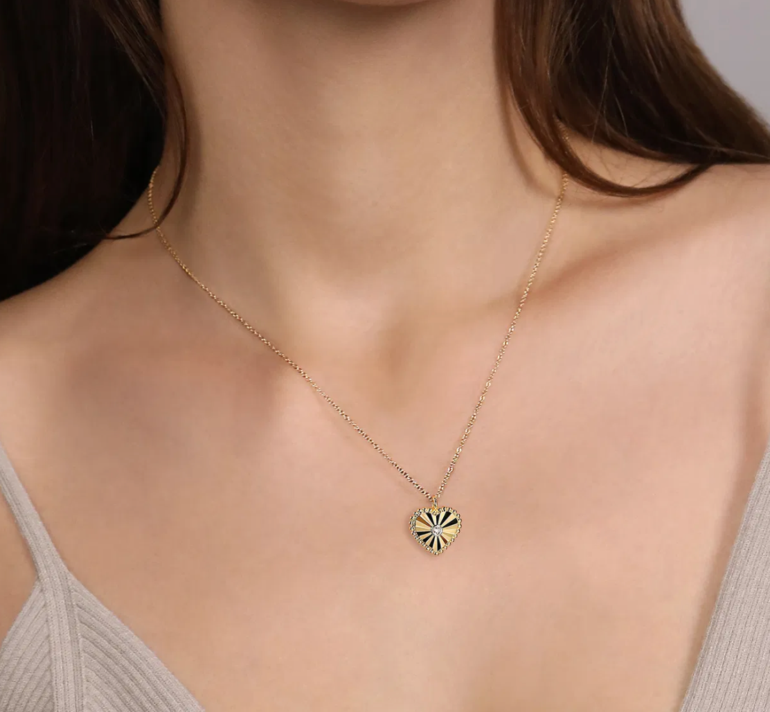 Capture her heart with this romantic and stylish pendant necklace. Diamond cut facets radiate out from a central 0.01ct diamond, while signature Bujukan beading frames the perimeter. This 14K yellow heart necklace comes complete with an adjustable chain.