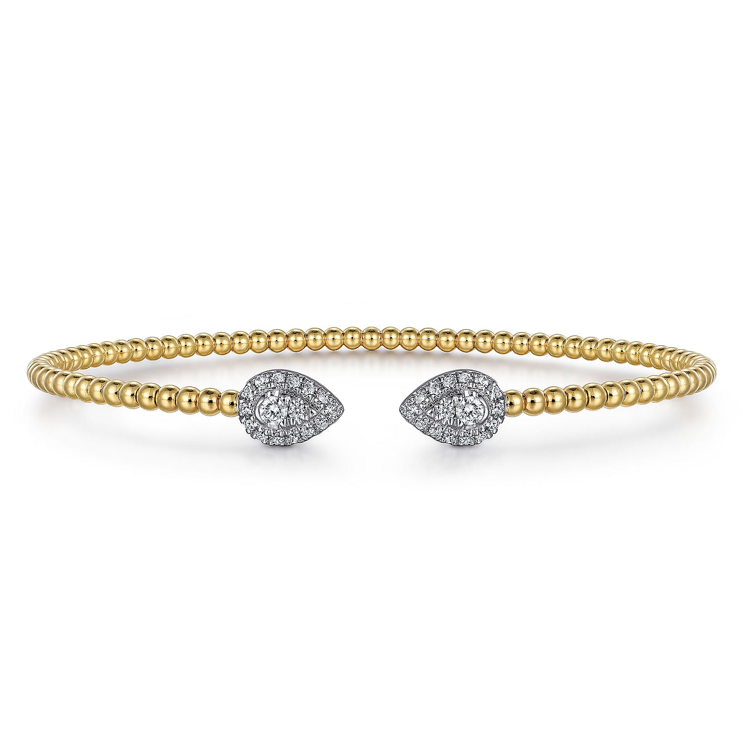 Pear shaped diamond clusters bedeck this beautiful Bujukan bracelet. Designed in a cuff style, the bracelet is open at the front, making way for two diamond adornments. Collectively, this 14K yellow gold beaded bracelet features 0.32cts of sparkle.