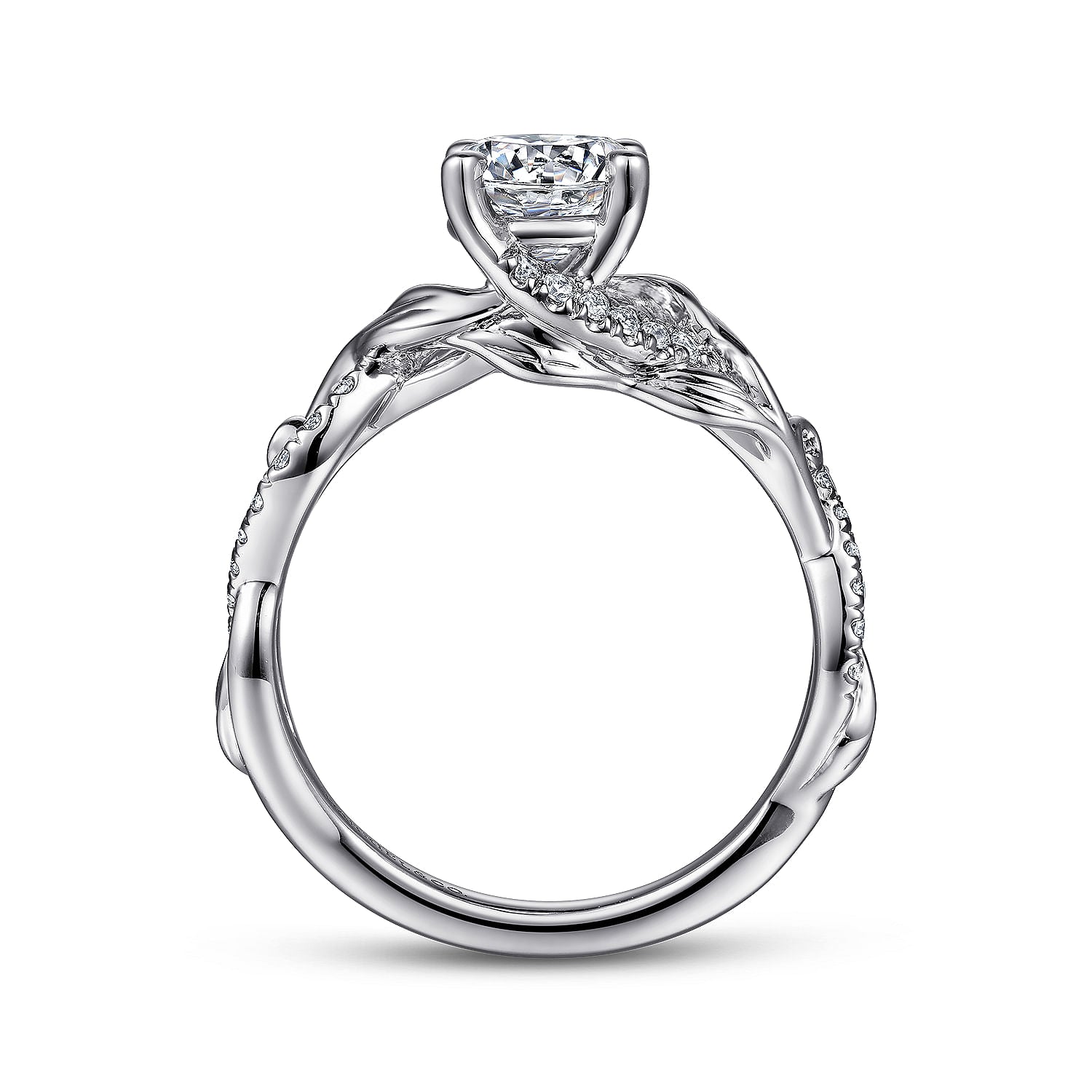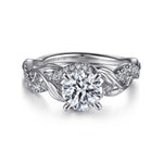 A curving garland of sculpted 14K white gold leaves and branches intertwines with a central strand of 0.18ct diamonds in this feminine free form engagement ring. Highlight your 1ct round center stone in this captivating floral ring.