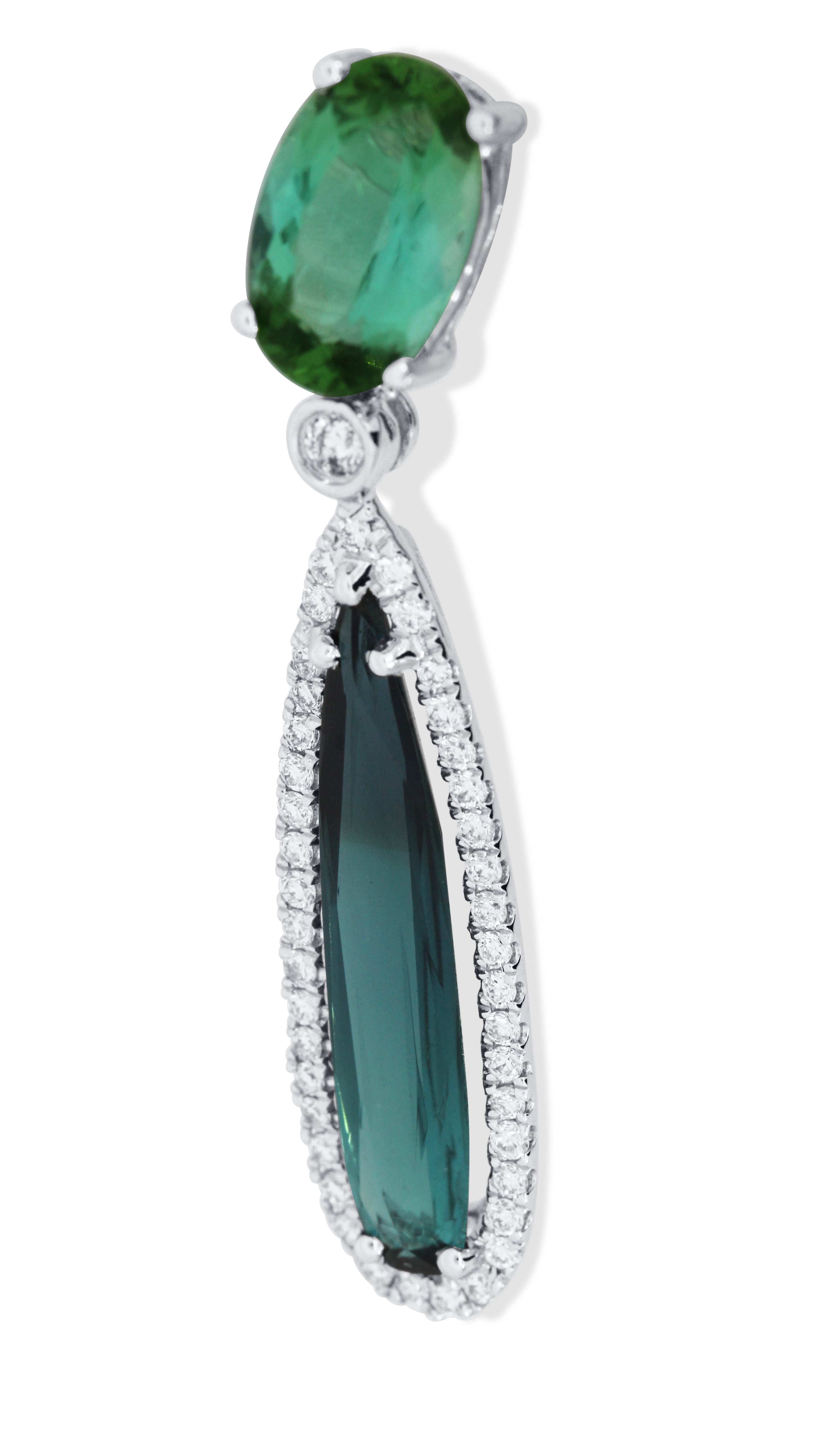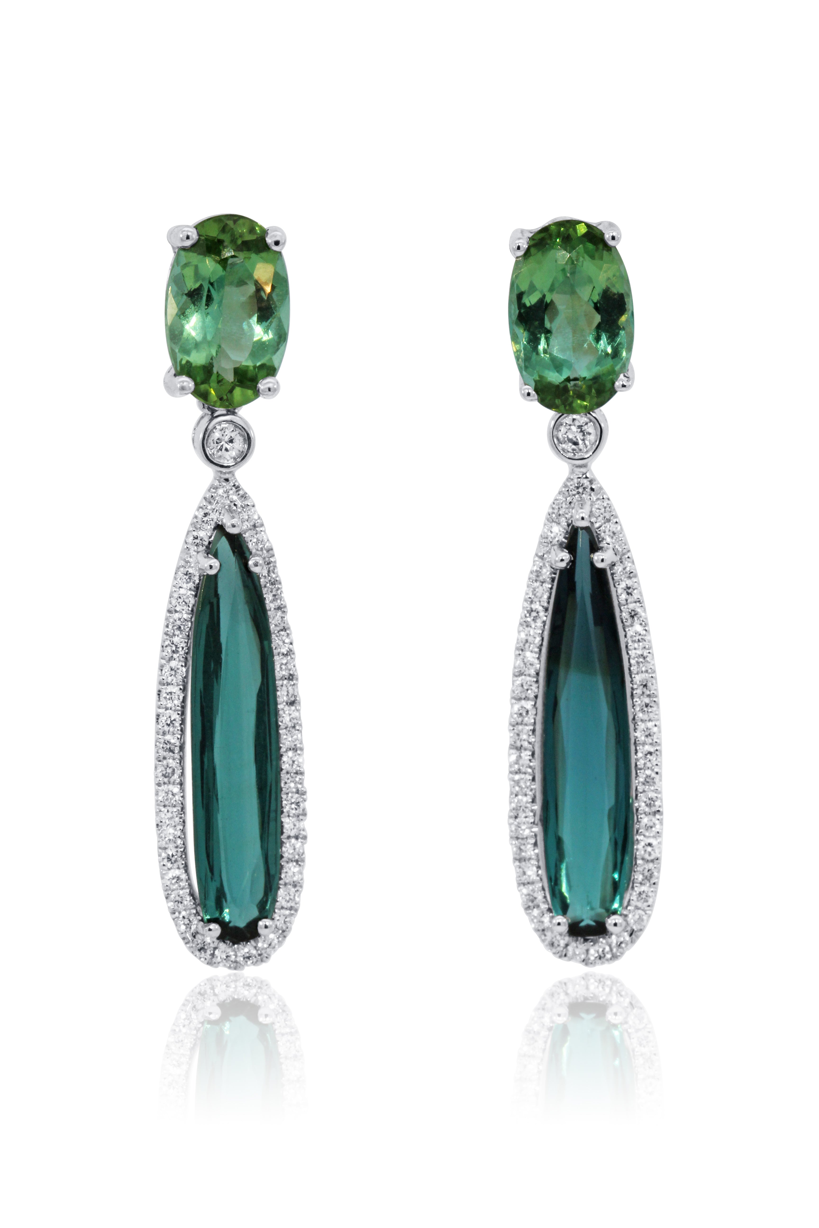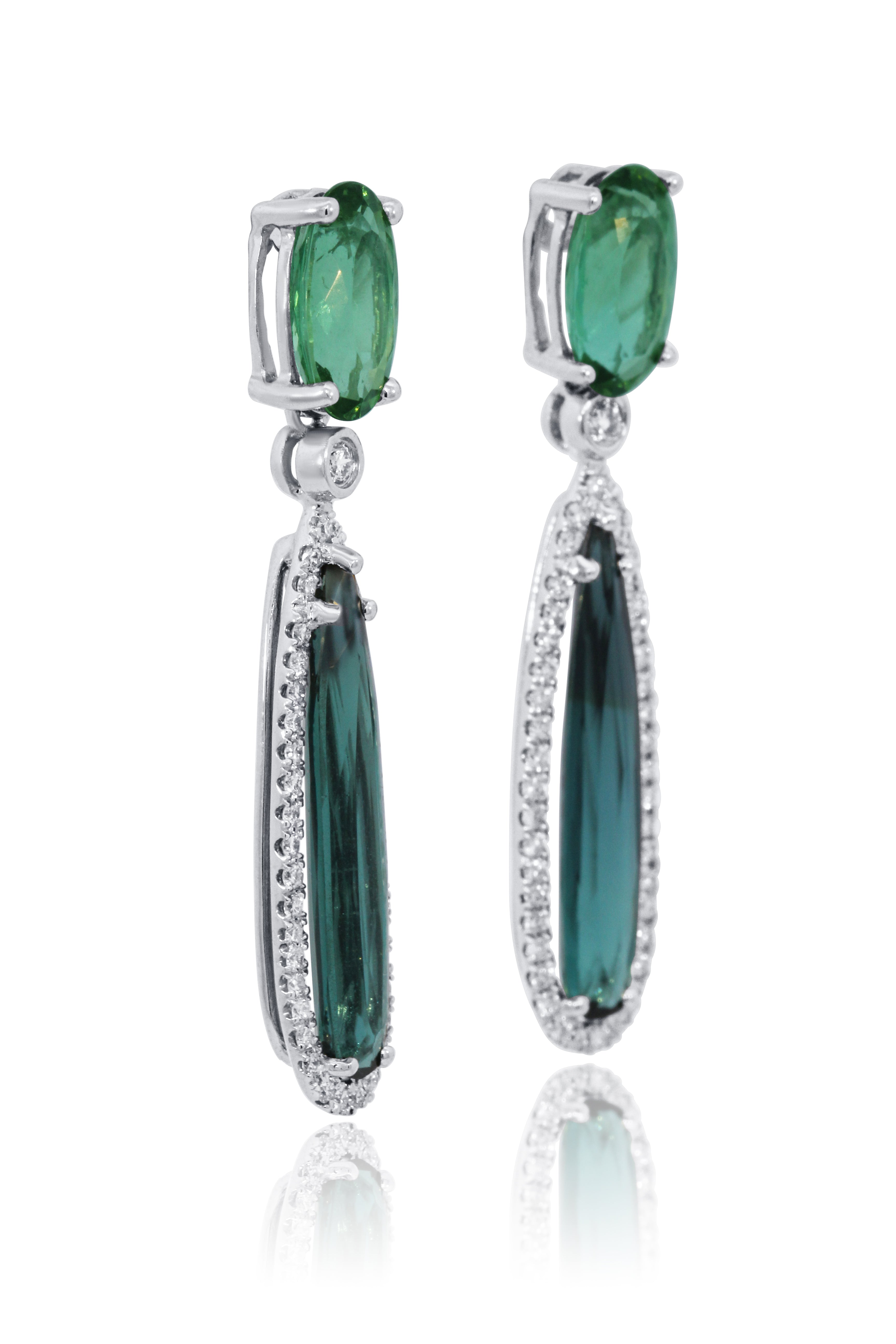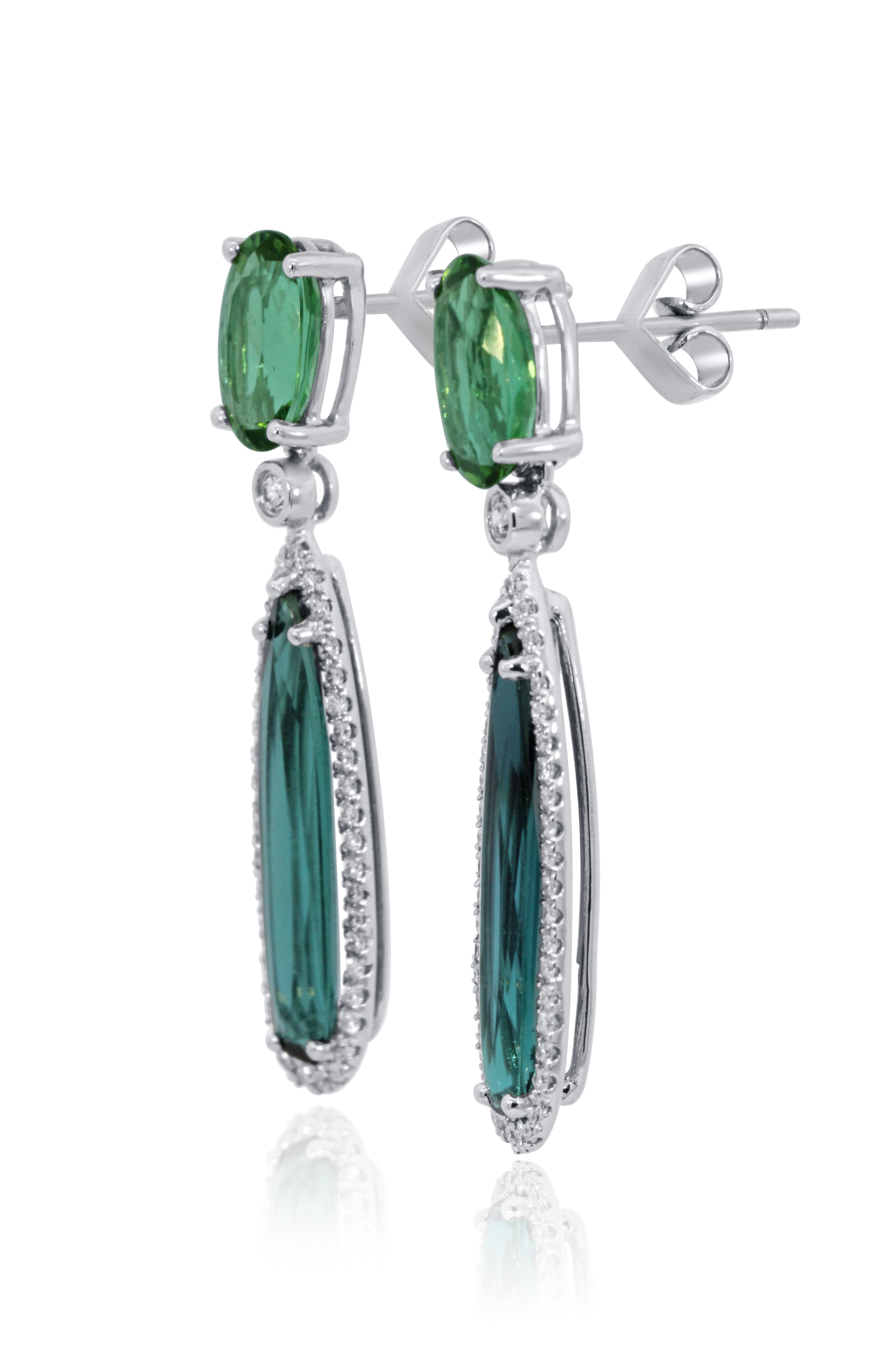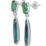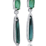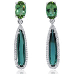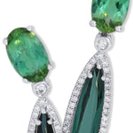 The refined elongated marquise drop shape creates a graceful silhouette that captures the light with every movement. The vivid green and teal hues of the faceted tourmaline stones evoke natural beauty and sophistication, making these earrings the perfect statement for both day and evening wear.