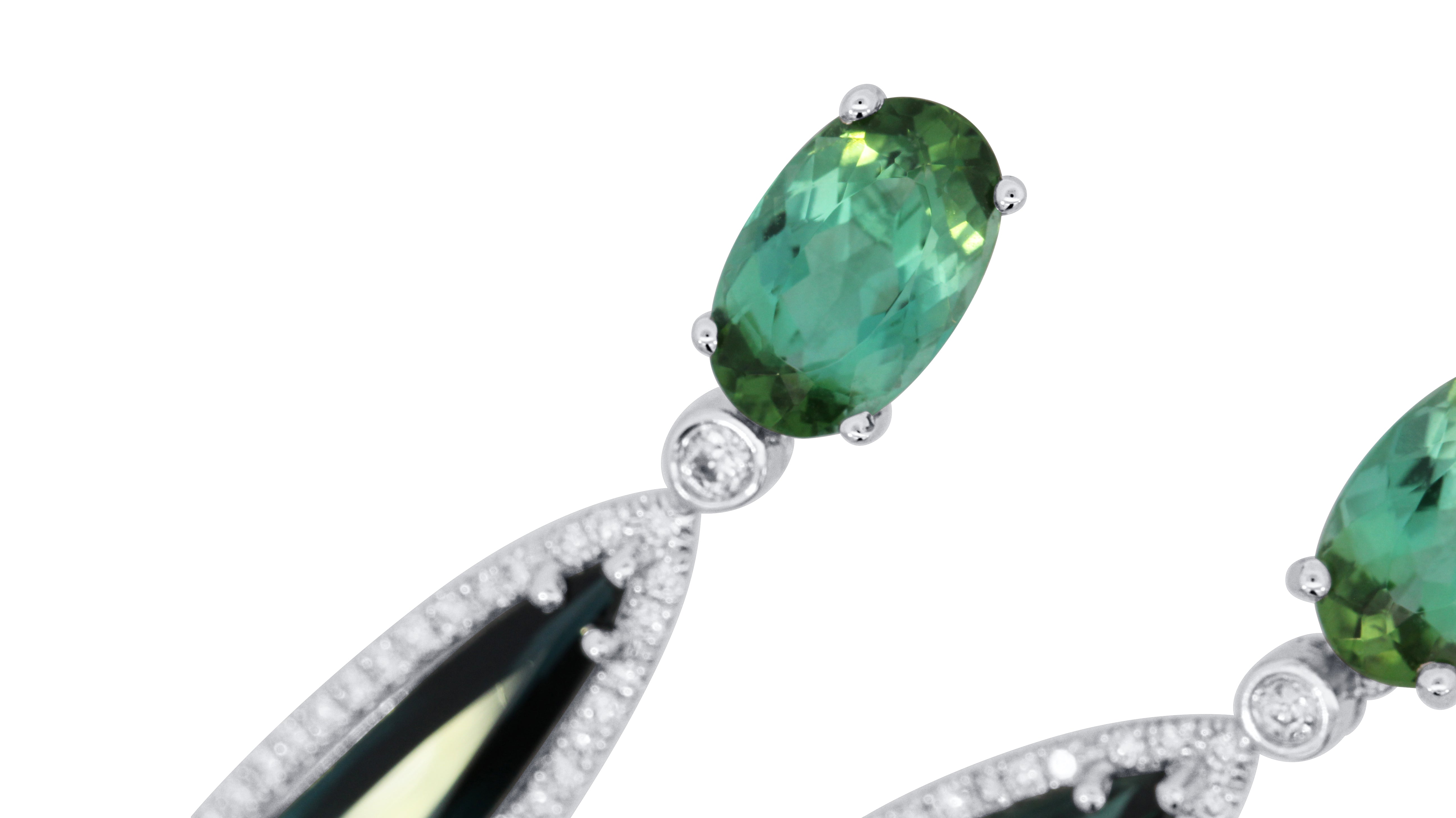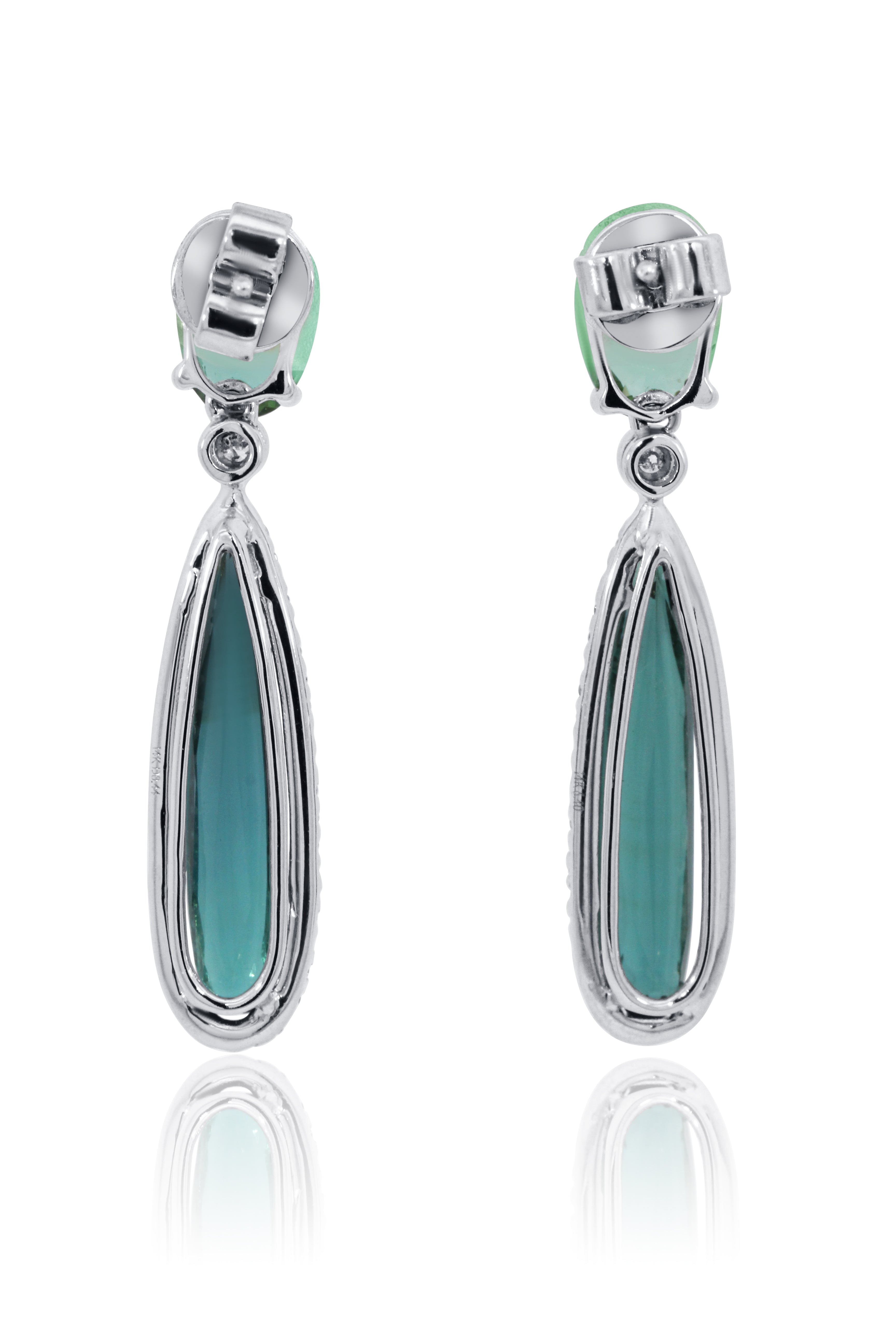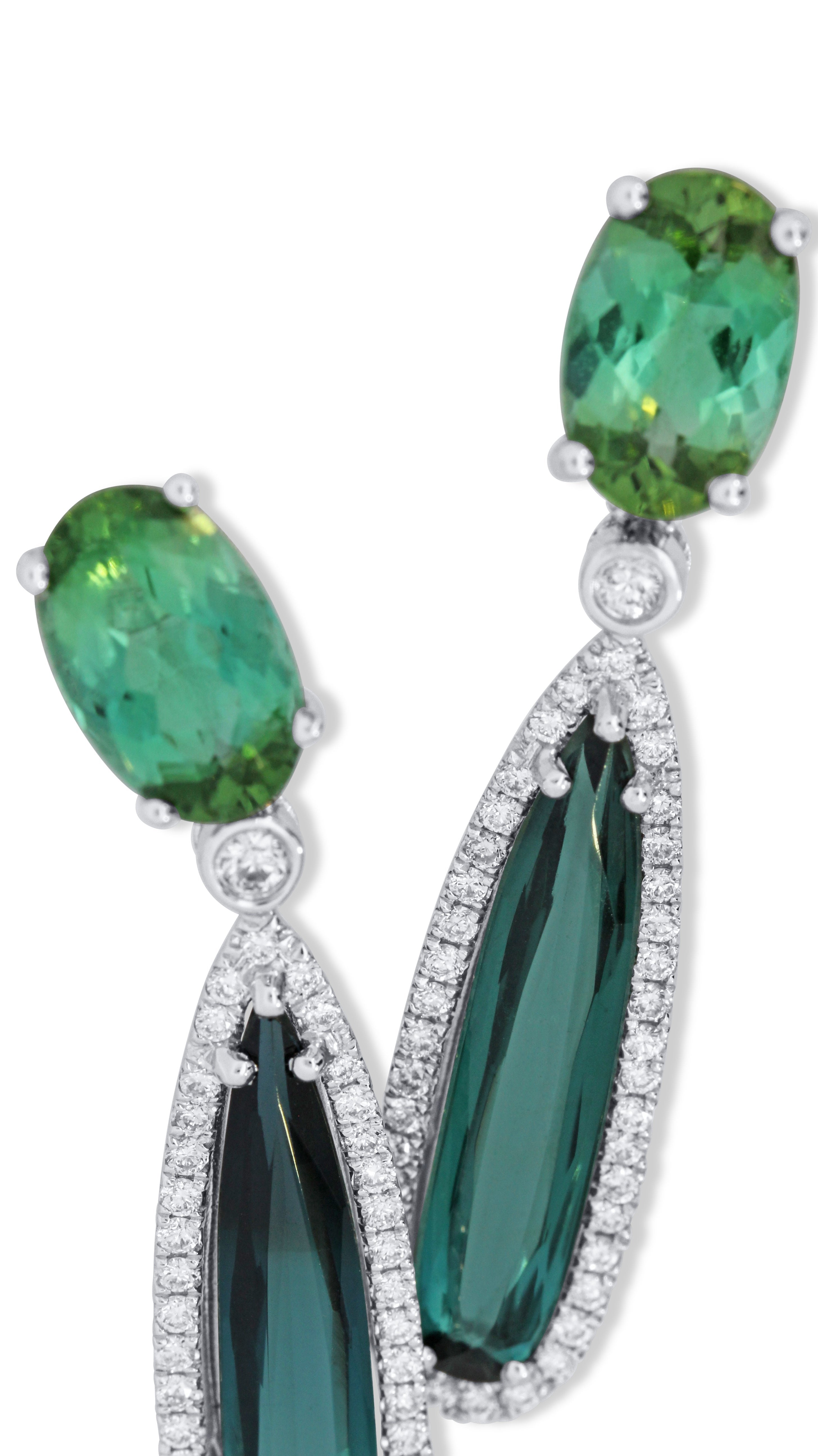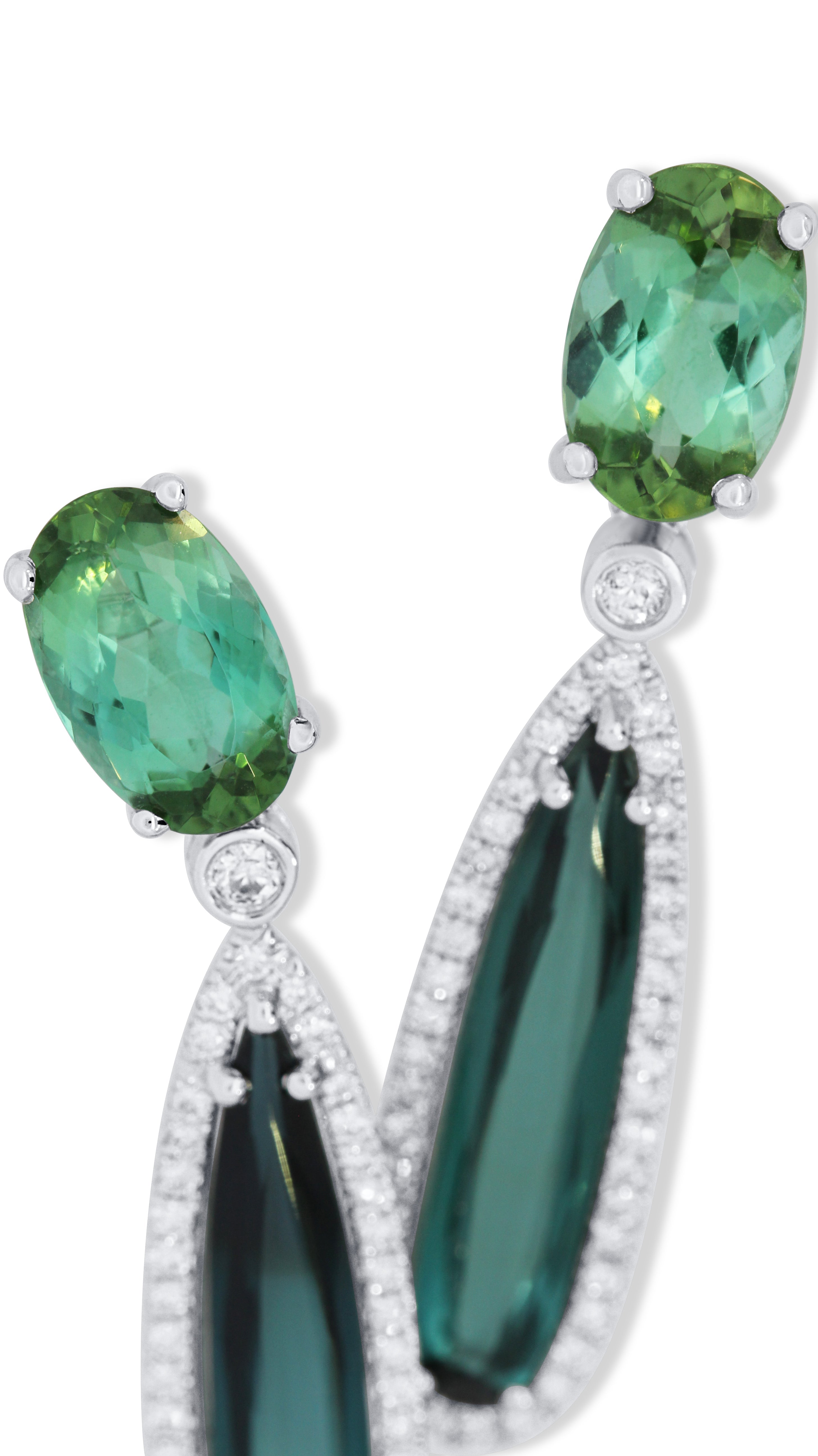 The refined elongated marquise drop shape creates a graceful silhouette that captures the light with every movement. The vivid green and teal hues of the faceted tourmaline stones evoke natural beauty and sophistication, making these earrings the perfect statement for both day and evening wear.