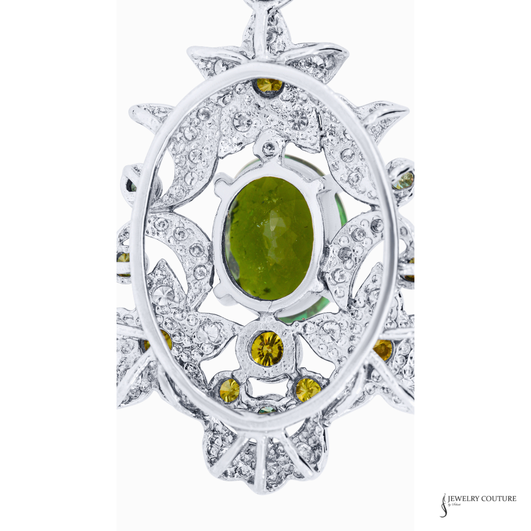 Add a touch of luxury and artistry to your jewelry collection with this breathtaking 14K White Gold Green Tourmaline and Diamond Pendant. Crafted with precision, this fine jewelry piece features a 5.73ct oval-cut green tourmaline, surrounded by a 2.95ct total weight of diamonds and accent gemstones in a floral-inspired design that exudes elegance and sophistication. Measuring 48mm in height, this pendant makes a captivating statement whether worn daily or on special occasions.