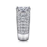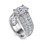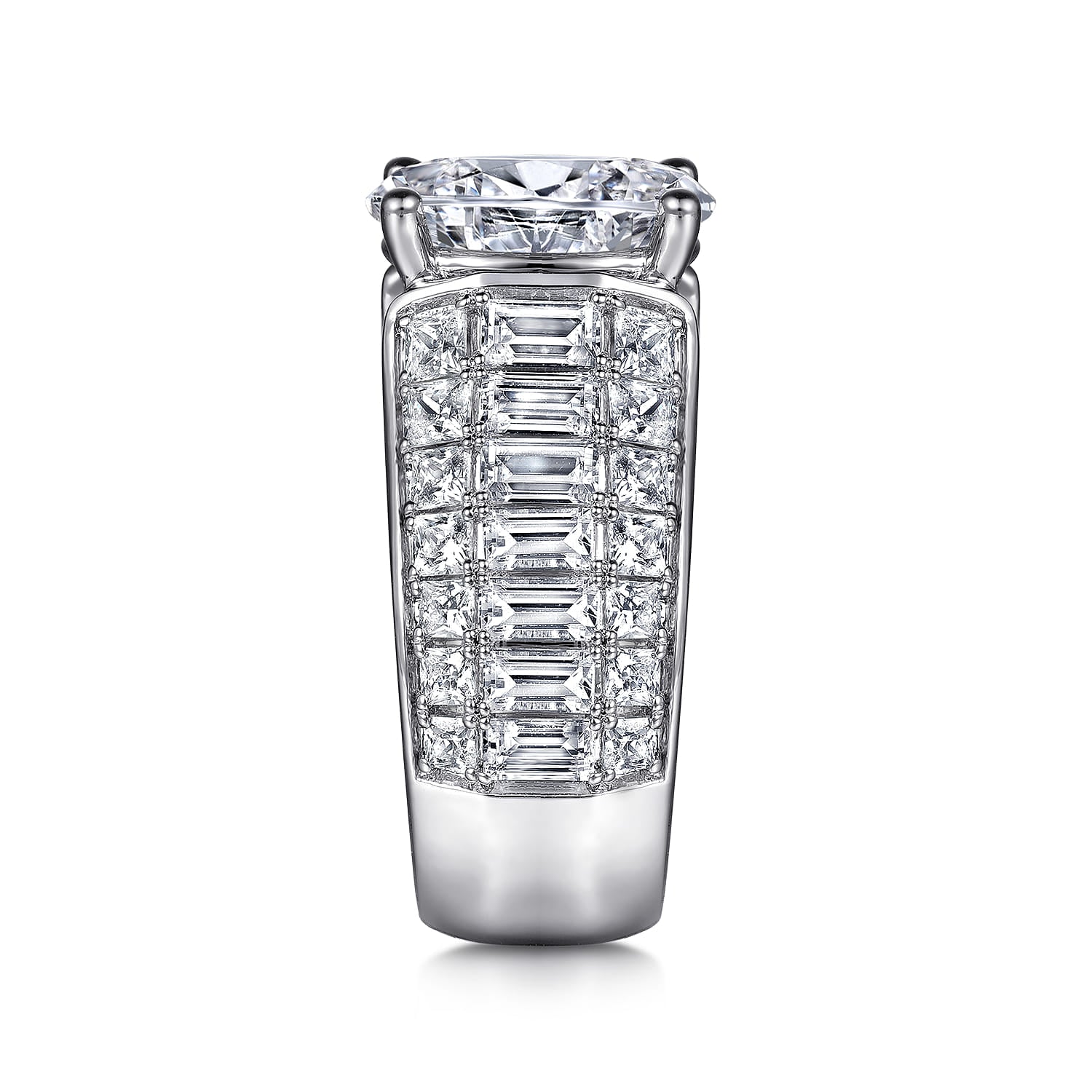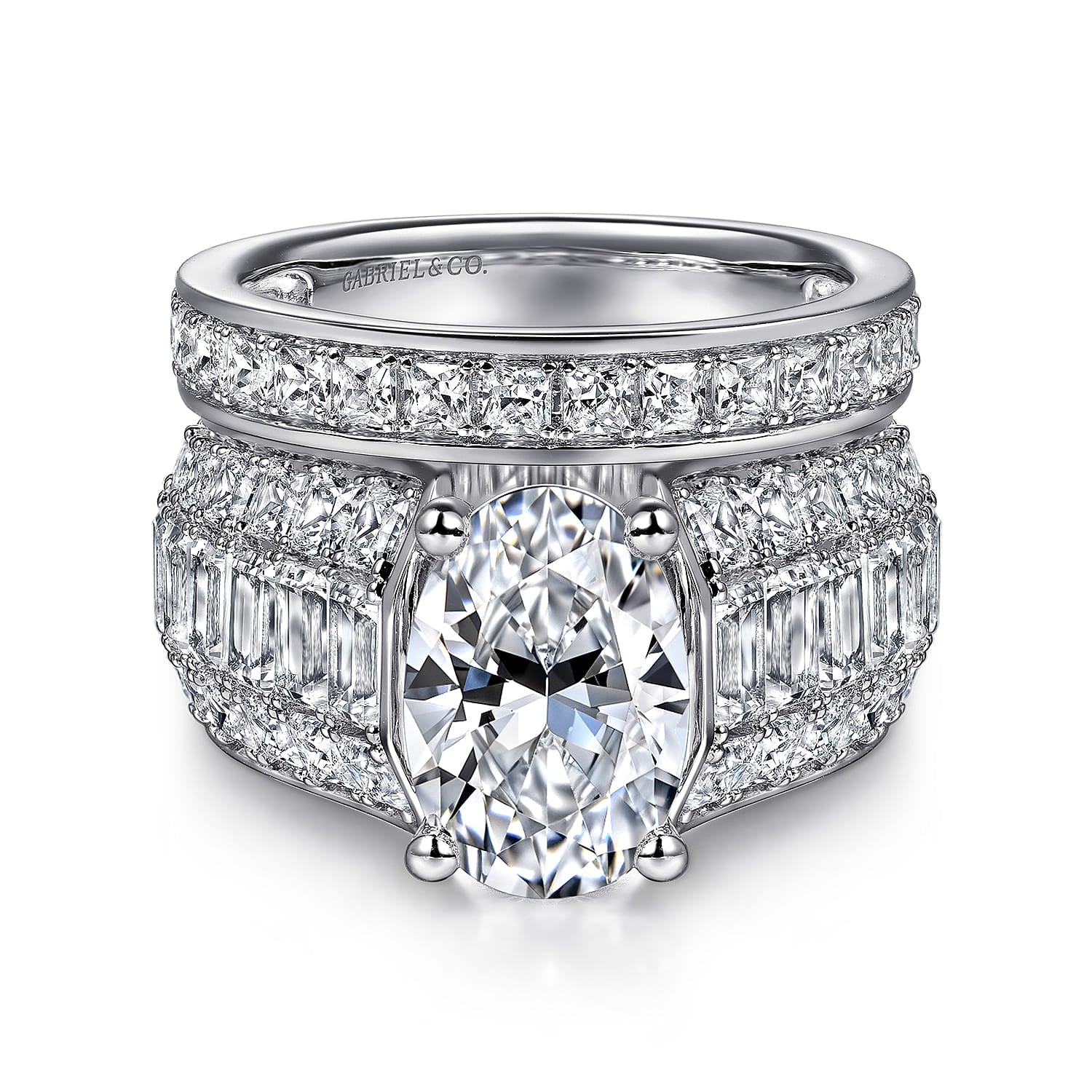 At the heart of this enchanting oval engagement ring shines a substantial 2.5 ct center stone, surrounded by the shimmering embrace of additional diamonds, bringing the total diamond weight to an impressive 2.61 ct. Meticulously crafted, this ring is more than an accessory—it's a radiant symbol of your unique and everlasting commitment, inviting you to celebrate the brilliance and beauty of your love story with every luminous detail. The cathedral setting with a wide band adds a touch of grace, while three rows of diamonds, featuring both baguette and princess cuts, create a mesmerizing display of brilliance.