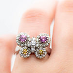 This exquisite floral-inspired design features two vivid round-cut natural pink sapphires (0.60ct total), paired with two radiant natural yellow sapphires (0.20ct total) and surrounded by a halo of brilliant white diamonds totaling 0.70ct. The result is a dazzling masterpiece that captures the beauty of spring blossoms and the timeless glamour of fine craftsmanship.