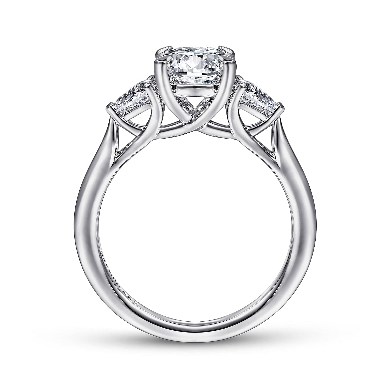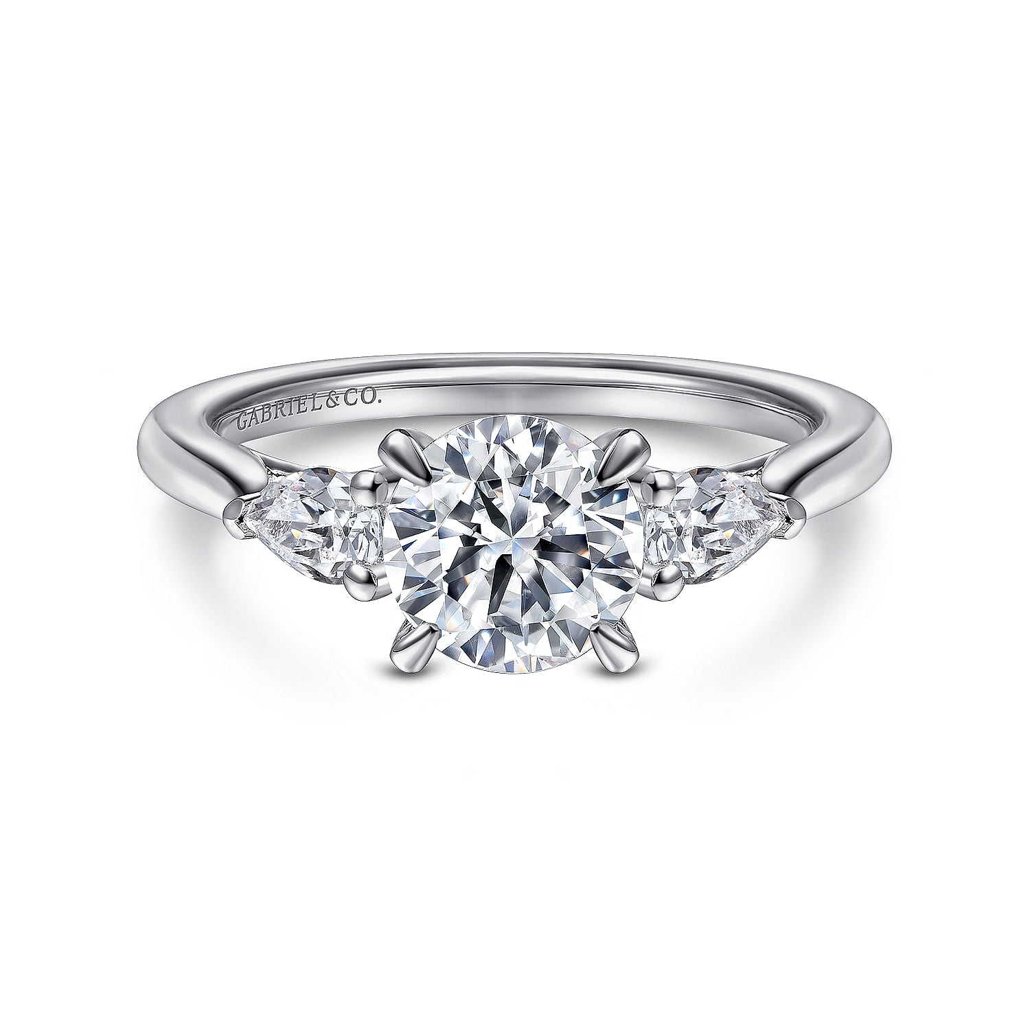Romantic 3 stone engagement ring settings represent the past, present and future of your love. Two pear shaped side stones grace this style, stationed on either side of a round center stone. Crafted from 14K white gold, this ring also features a polished shank and trellis settings.