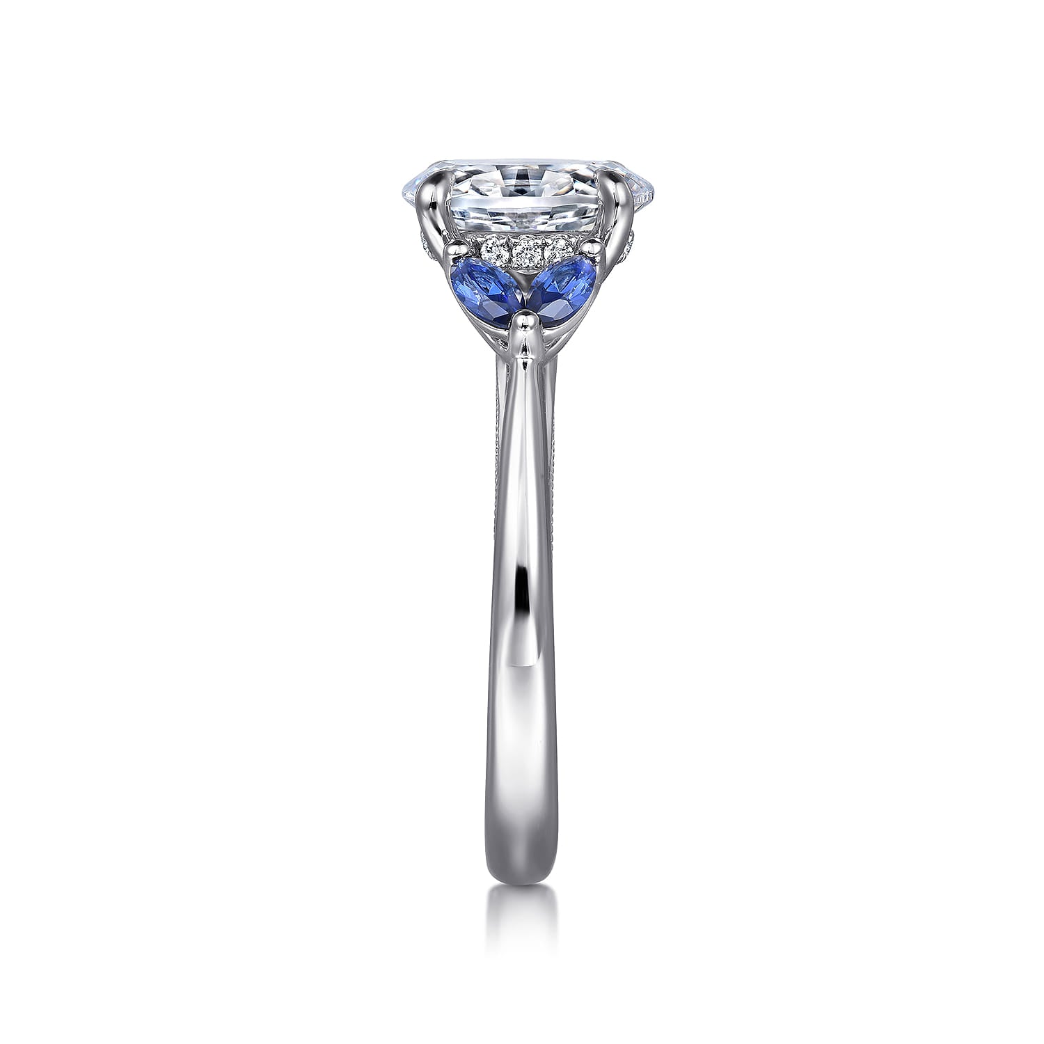 Paired with lush blue sapphire side stones in a delicate marquise shape, your 1.5ct oval center stone takes on a subtle floral appearance. Crafted in polished 14K white gold, it features a taper shank that emphasizes the chic 3 stone style. A hidden 0.06ct diamond halo and milgrain detailing on the inner shank add interest to the design in profile.