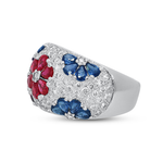 Celebrate color, elegance, and timeless craftsmanship with this stunning 14K white gold ruby, sapphire, and diamond flower ring, a luxurious piece of multi-colored gemstone fine jewelry designed to make a bold statement.