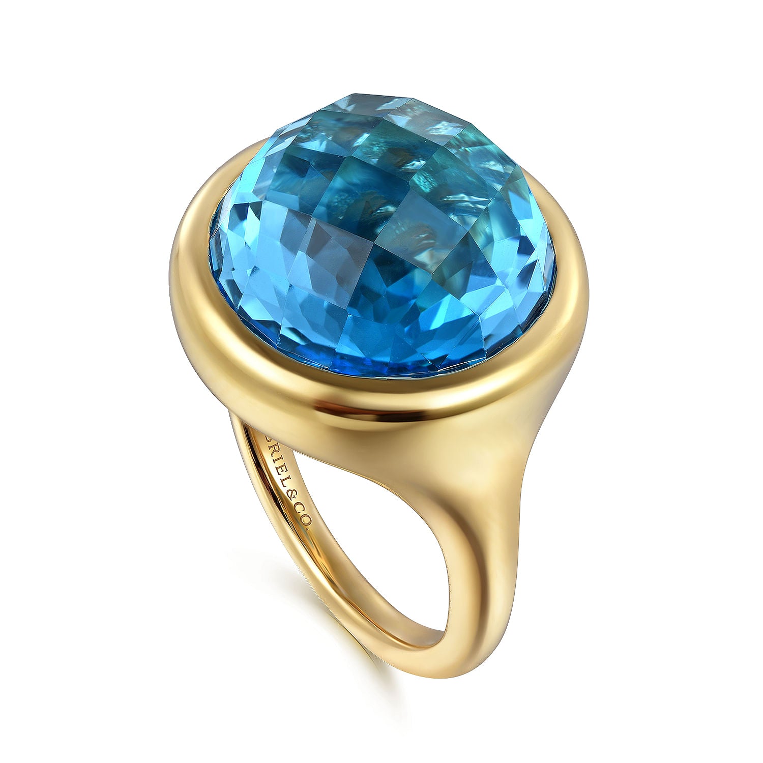 14K Yellow Gold Blue Topaz Round Shape Ladies Ring With Flower Pattern J-Back In-Store