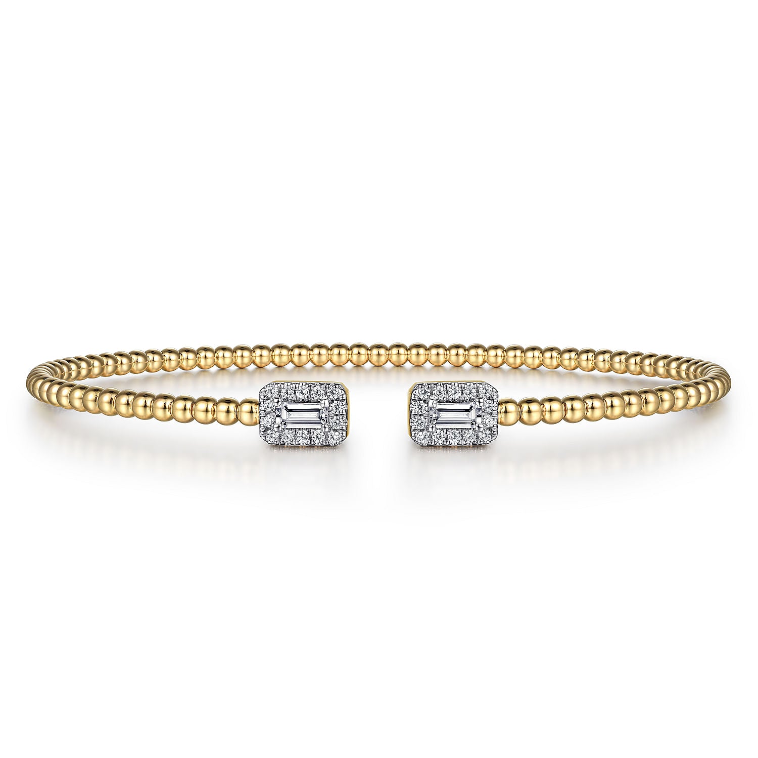 Diamond finials add eye-catching sparkle to this Bujukan cuff bracelet. Crafted from 14K yellow gold with a beaded texture, the cuff is capped by baguette diamonds with cushion shaped pavé diamond halos. This captivating combination makes for a bracelet you'll want to wear every day.