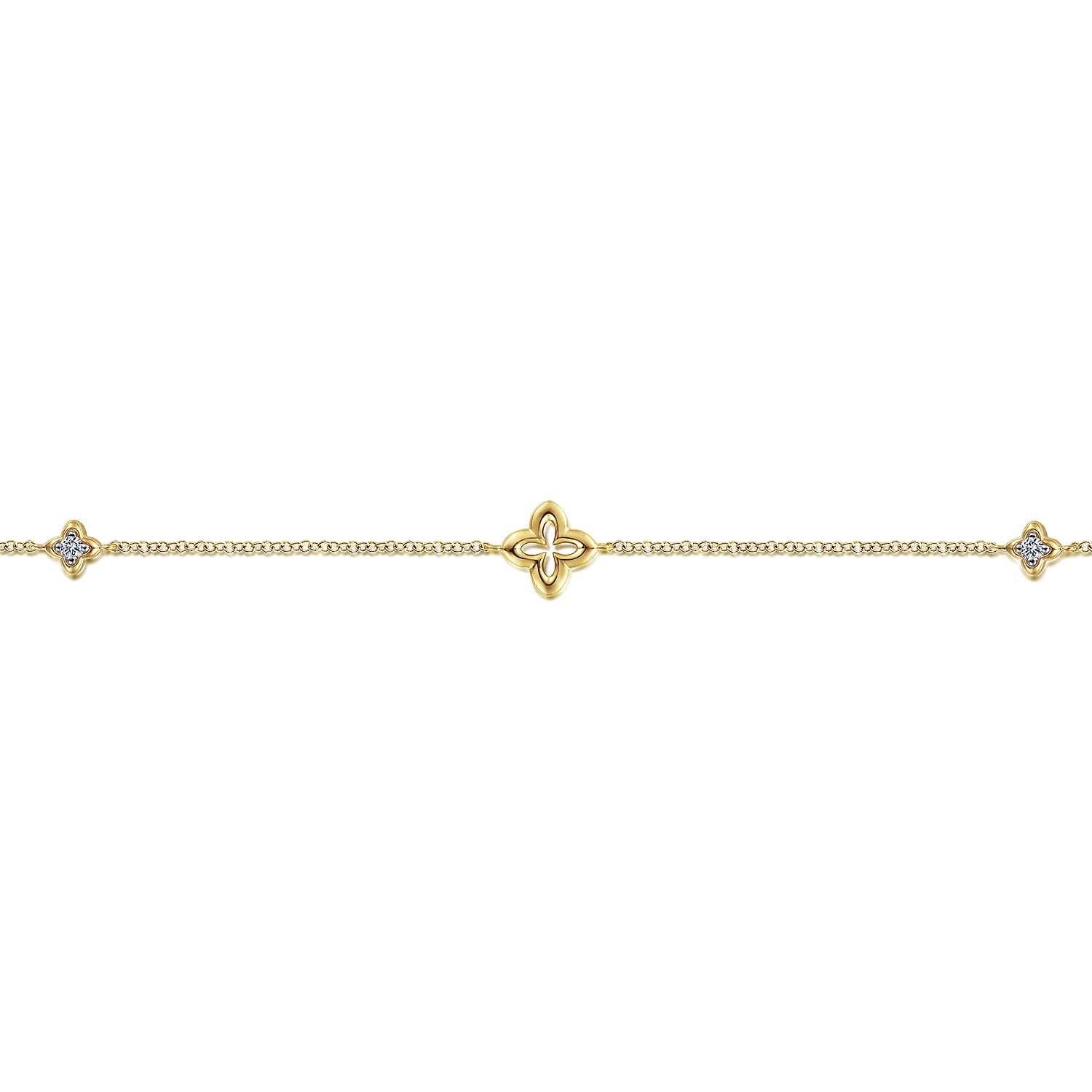 Warm tones of 14K yellow gold highlight the foundation of this chain style bracelet. Adding a touch of whimsical geometry, two gold clover stations accented with white sapphire gemstones surround one larger clover shape that symbolizes the wearer's attraction to good luck, faith, hope and love.