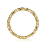 Luminous 14K yellow gold ring designed for stacking featuring brilliant 0.10ct diamonds. Marquise shapes create a scalloped silhouette, elevated with milgrain borders and engraving along the profile of the stackable band.