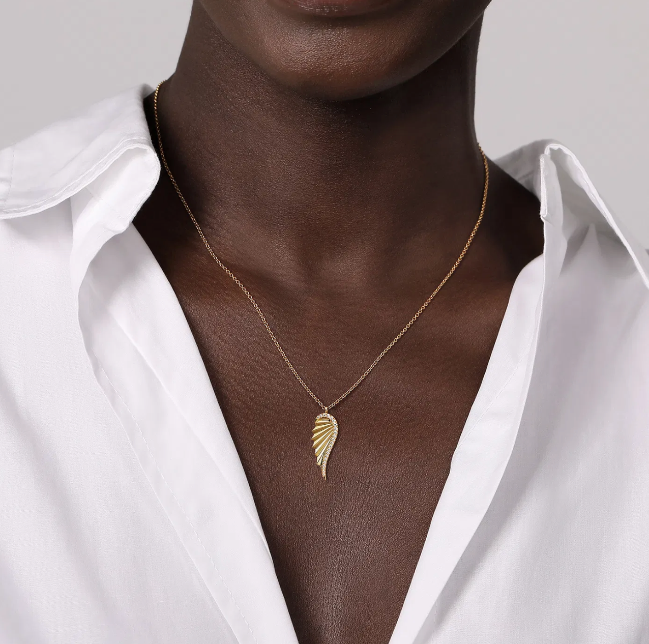 14K Yellow Gold Diamond Cut Wing Shape Pendant Necklace