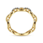 Delicately sculpted 14K yellow gold chain links adorn this unique fashion ring. Across the top of the ring, two shimmering links are encrusted with 0.06cts of pavé diamonds for an irresistible pop of sparkle.