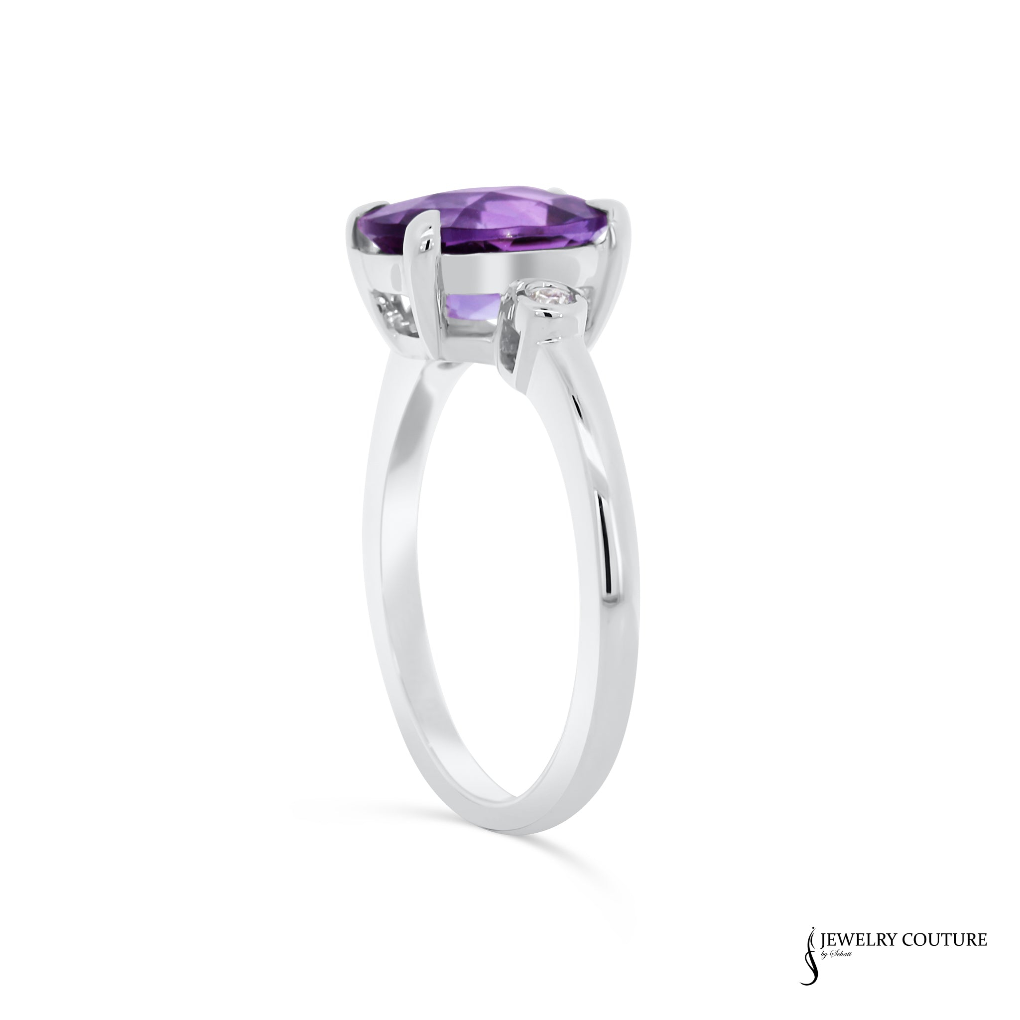 Celebrate timeless elegance with this 14KT White Gold 3-Stone Ring, featuring a stunning 1.94CT oval-cut amethyst flanked by 0.03CT total weight diamonds. The deep purple hue of the amethyst symbolizes passion and sophistication, while the sparkling diamonds add a touch of brilliance.