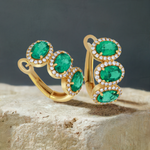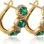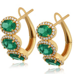 Stunning 14KT yellow gold hoop earrings feature a trio of richly saturated oval-cut emeralds, totaling 2.41 carats. Each emerald is individually surrounded by a halo of brilliant-cut diamonds, adding up to 0.40 carats total weight for unmatched sparkle.