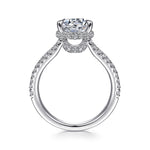 Crafted to accentuate the shape, size and shimmer of a round cut center stone, this split shank engagement ring is a bold and beautiful choice. Diamonds encrust the divided 18k white gold shank and flow into the curved bridge beneath the crown.