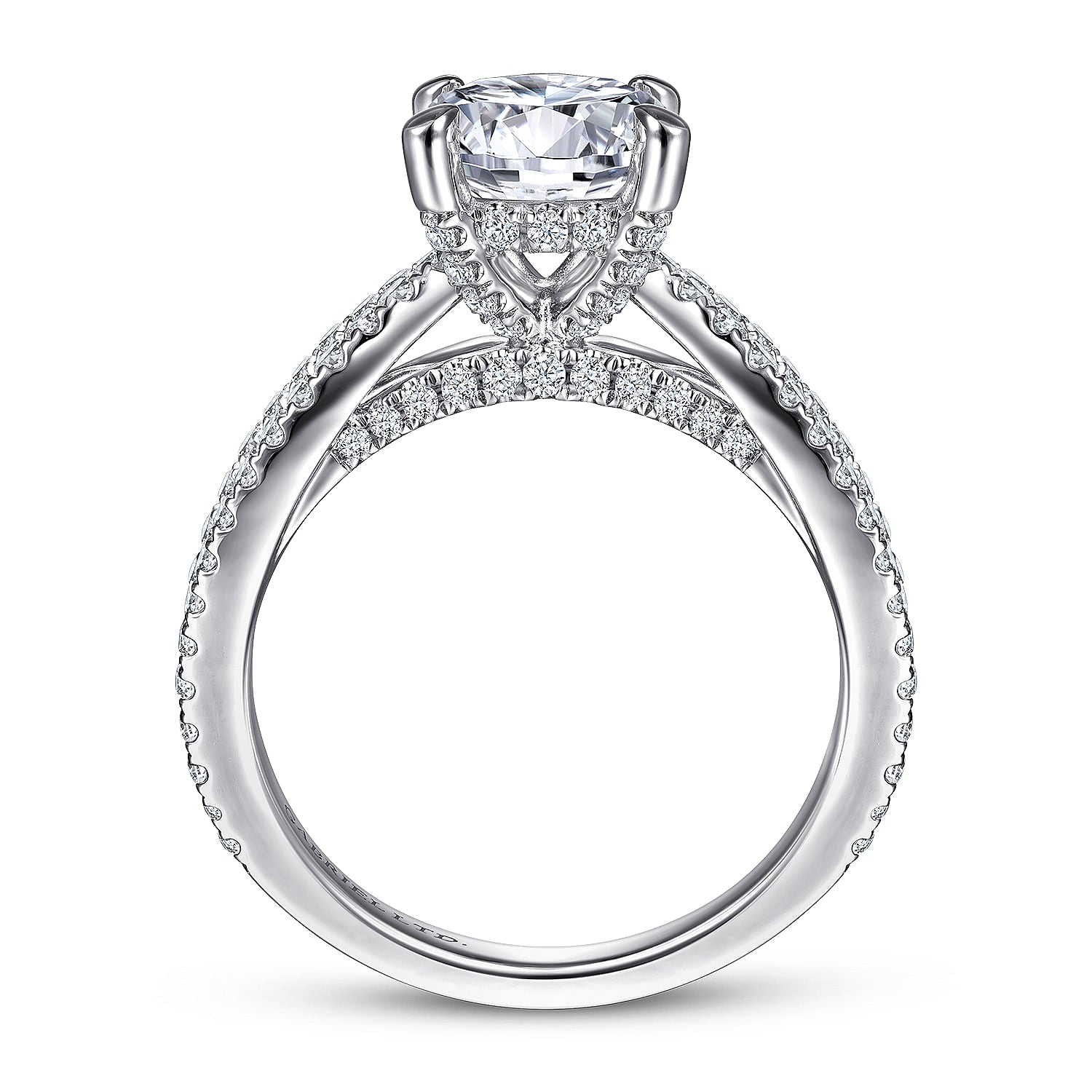 Elevate a classic round cut center stone with this light and airy 18K white gold setting. Along the graceful curves of the split shank, pavé diamonds create sweeping sparkle. The curving diamond gallery and basket concealed beneath create surprise sparkle reserved for your beloved. Collectively this regal ring boasts 0.68cts of diamonds.