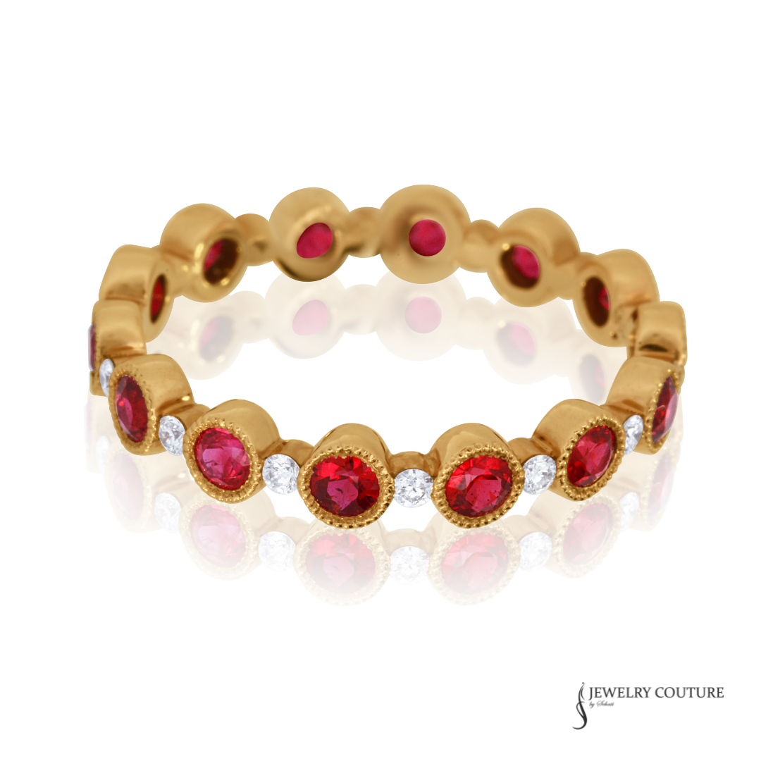 The continuous circle of alternating rubies and diamonds symbolizes eternal love, making it a meaningful choice for anniversaries, wedding bands, or luxurious stackable everyday rings.