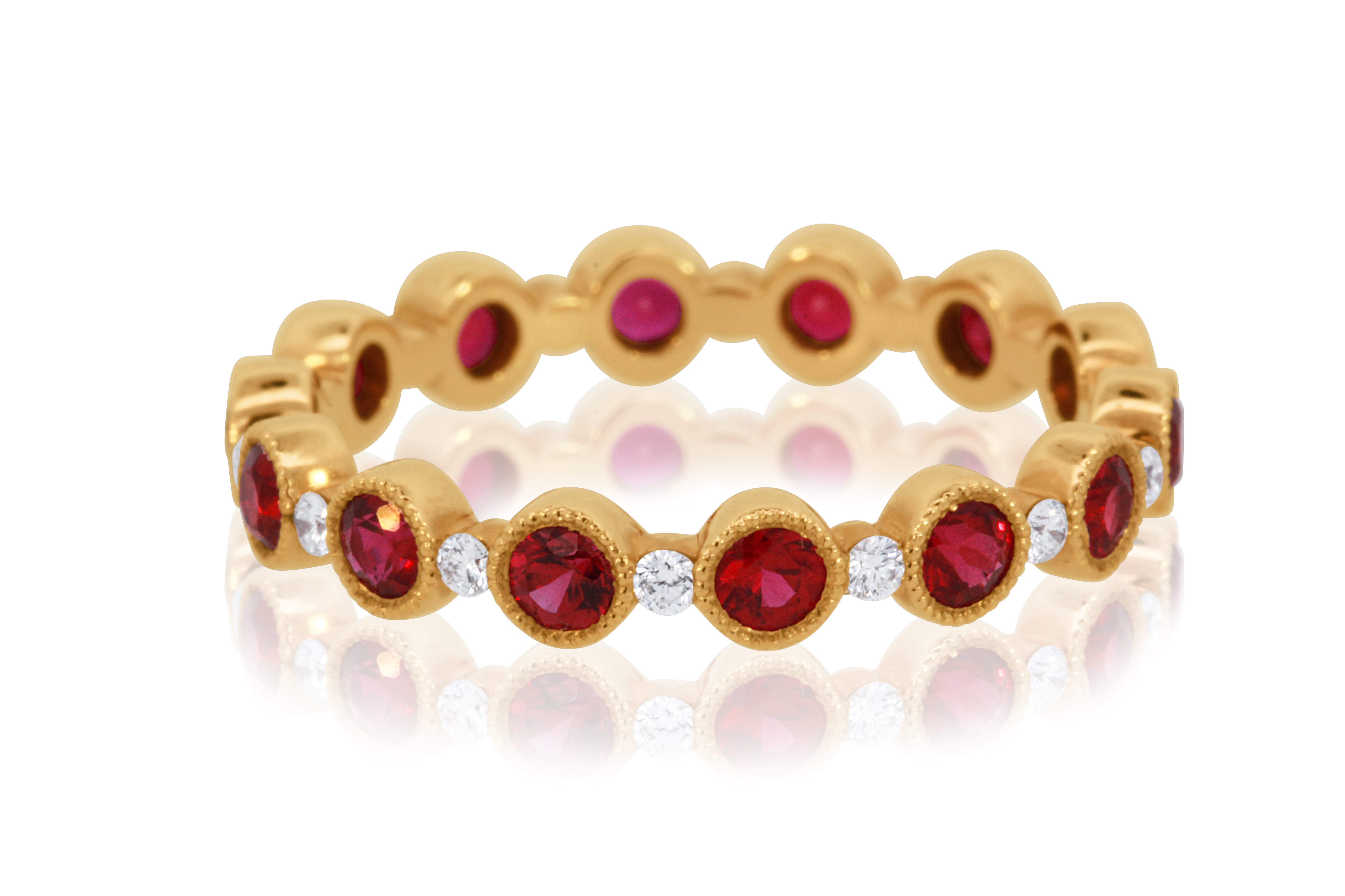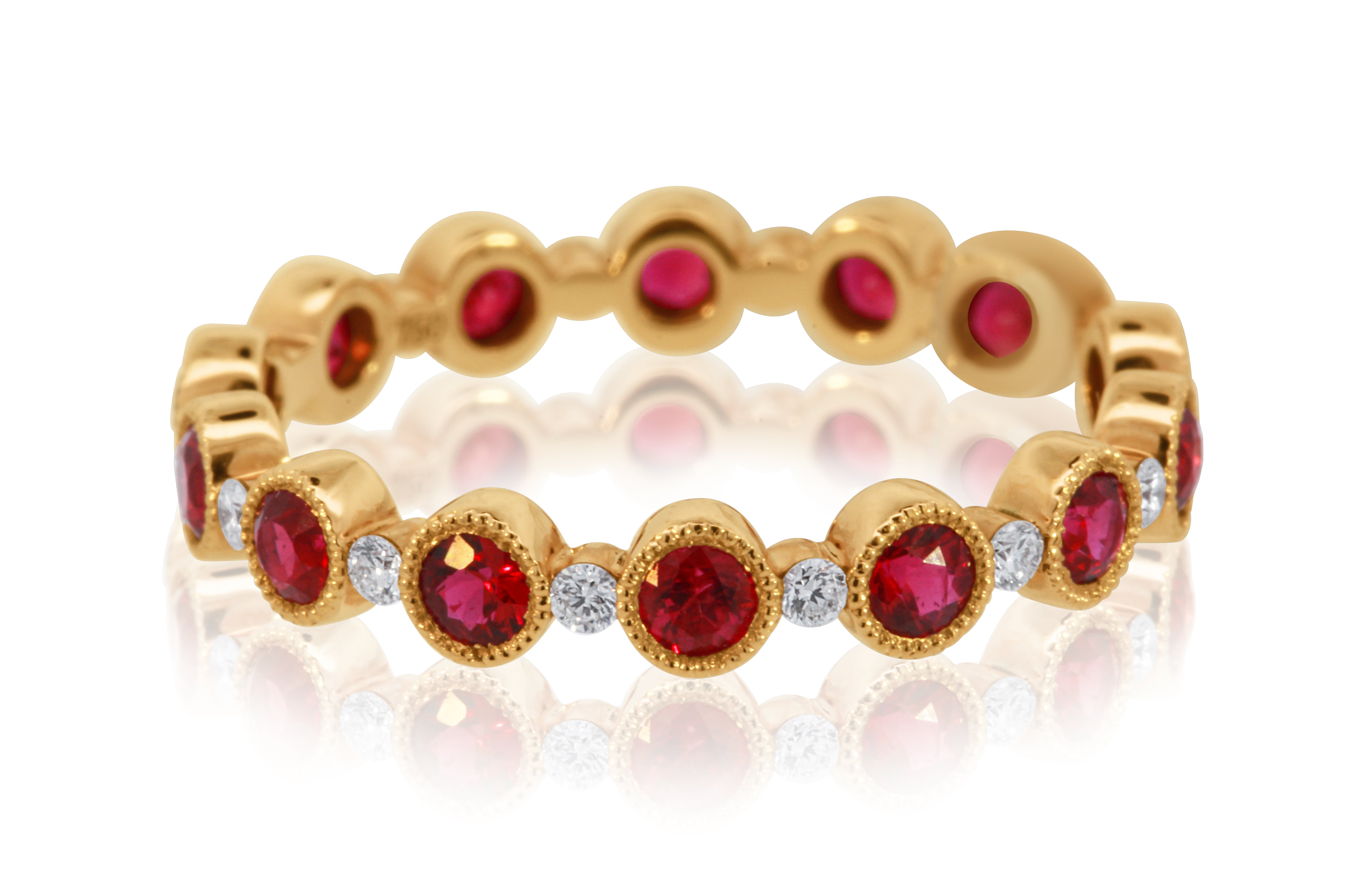 Exquisite 18KT Yellow Gold Ruby and Diamond Eternity Band. Crafted with precision and passion, this ring features vivid round-cut rubies totaling 1.10 carats, each set in elegant milgrain bezels, perfectly accented with 0.17 carats of round brilliant diamonds.