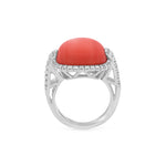 Elevate your jewelry collection with this exquisite 18KT white gold ring featuring a striking coral cabochon centerpiece. Framed by 0.60 carats total weight of brilliant round diamonds, this piece balances bold color with timeless elegance. The openwork split shank and diamond-accented profile add dimension and radiance from every angle.