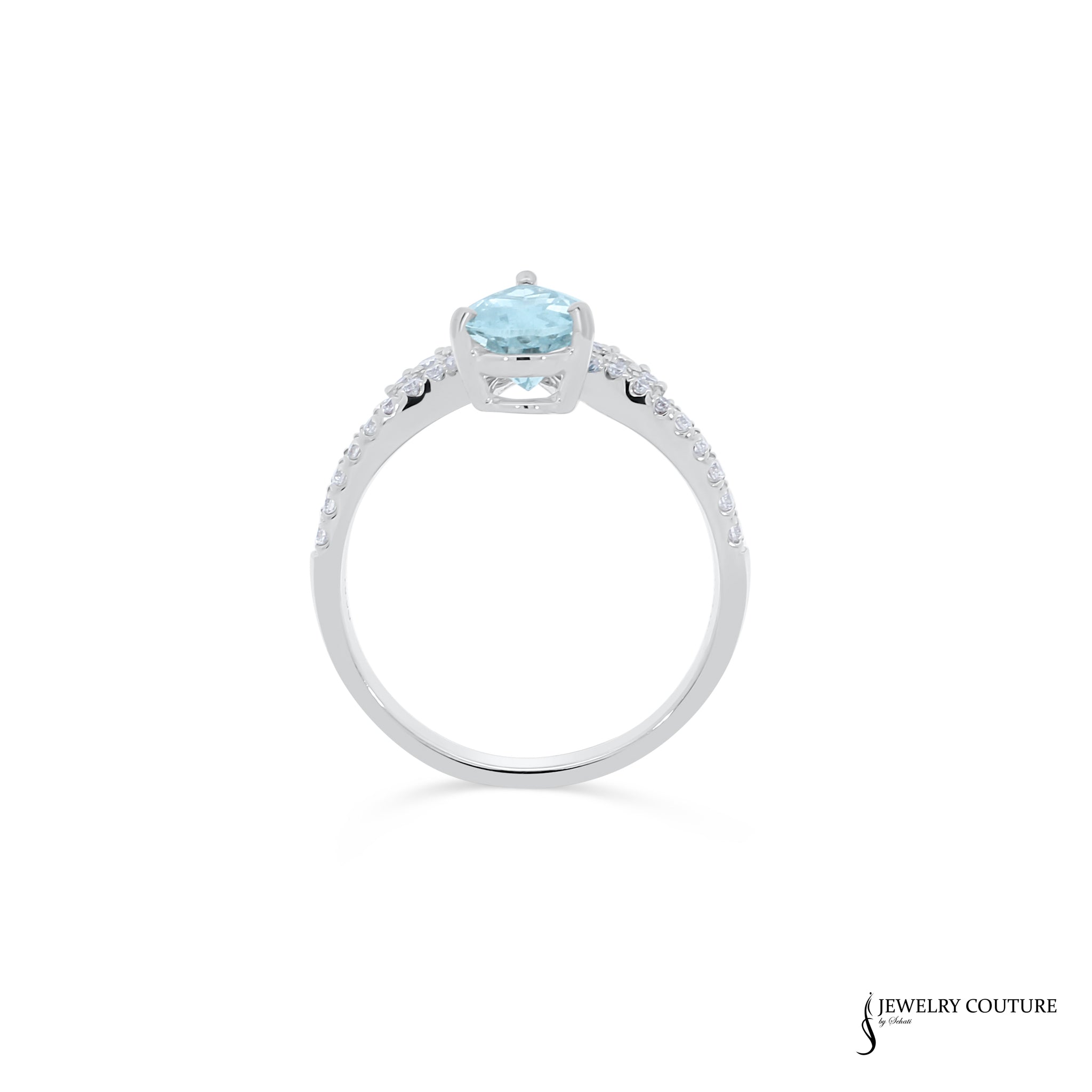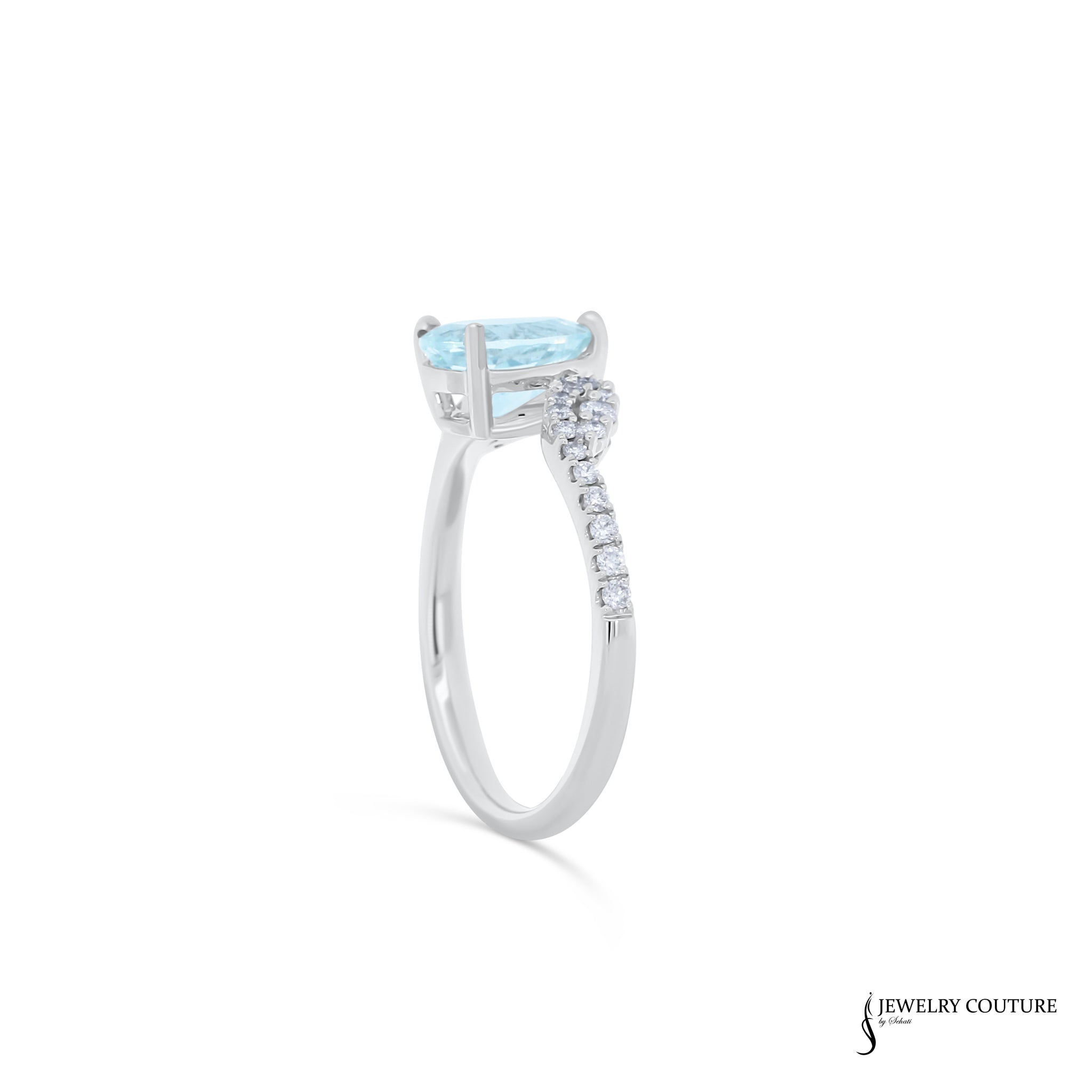 Elevate your elegance with this exquisite 18KT White Gold Pear Aquamarine & Diamond Ring, featuring a stunning 1CT pear-cut aquamarine that captivates with its serene blue hue. Accented by 0.24CT total weight of shimmering diamonds, this ring exudes brilliance and sophistication. The graceful pear-cut design enhances the aquamarine’s natural radiance, making it a timeless statement piece.