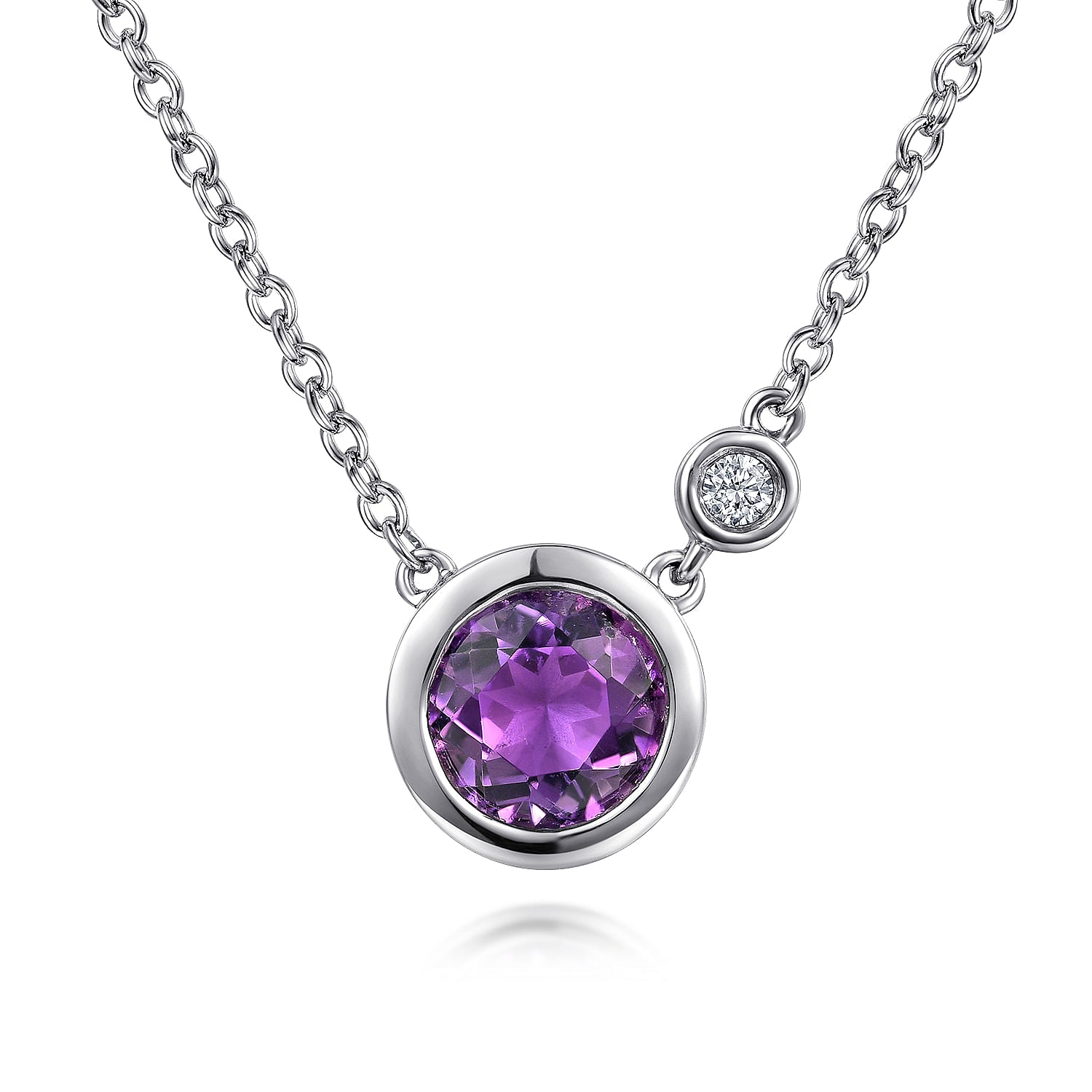 Pretty in purple. Crafted from polished sterling silver with a slim cable chain, this colorful necklace highlights a vivid bezel set amethyst center. A dainty .02ct round diamond provides the perfect subtle embellishment. This meaningful necklace is a perfect February birthday gift.