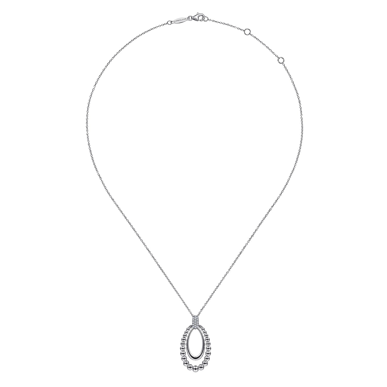 This oval pendant necklace has a light and airy feel perfect for pairing with easy going ensembles. The pendant features two layered silhouettes, one smooth and one beaded, connected to a slim cable chain via a sparkling white sapphire bale. Slip on this 925 sterling silver and white sapphire necklace for instant sophistication.