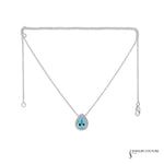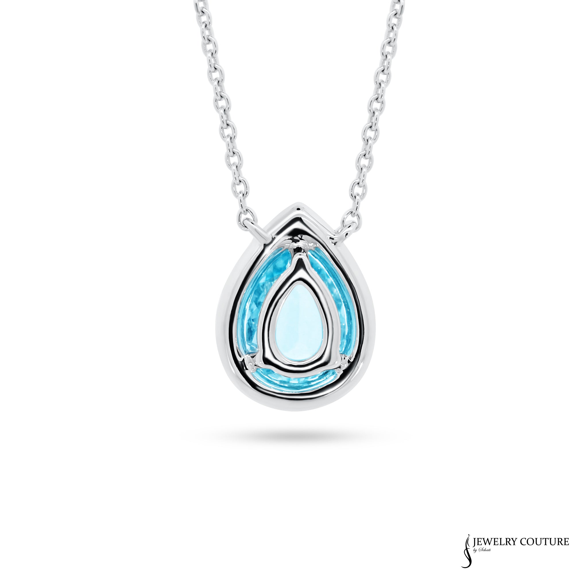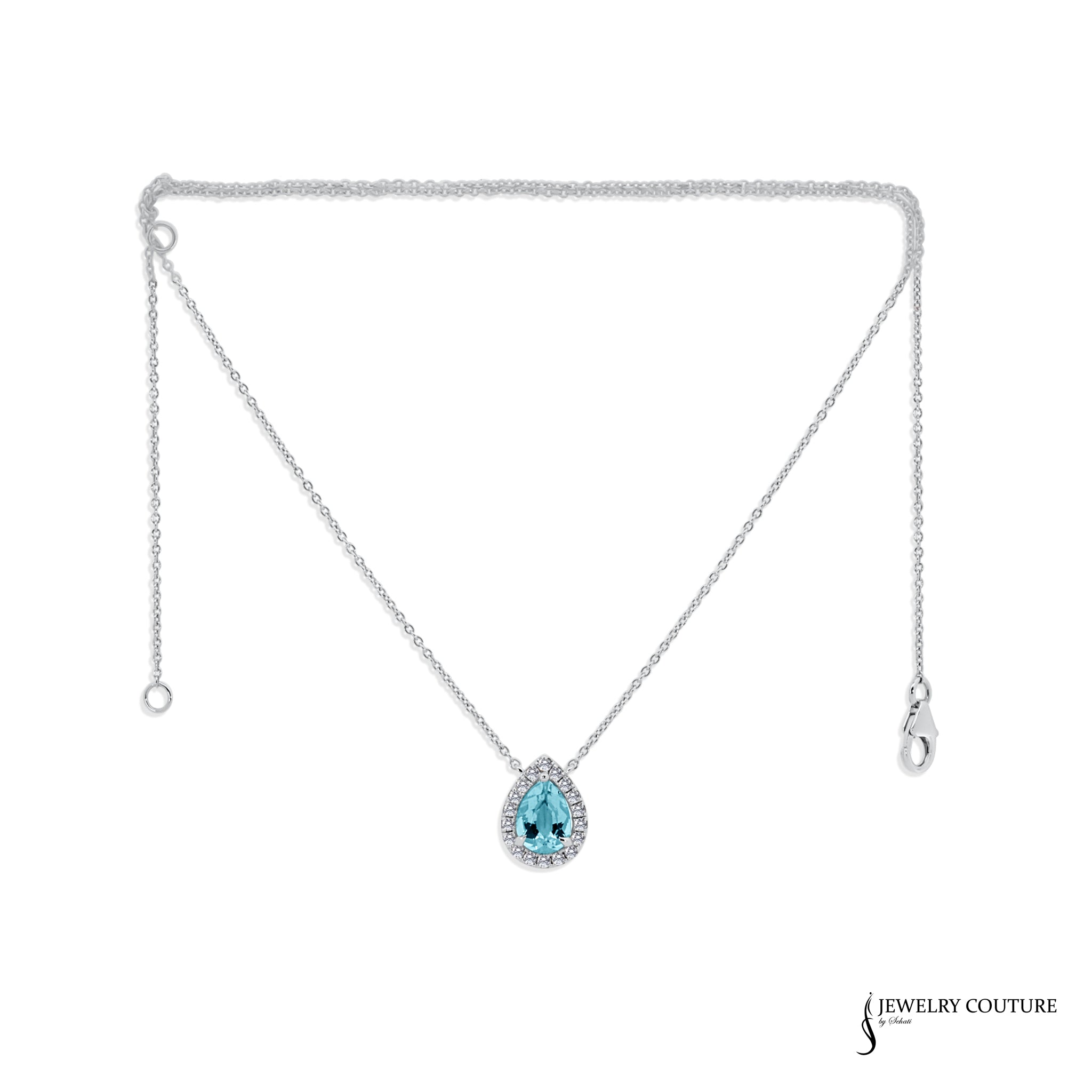 Graceful and enchanting, this 14KT White Gold Necklace features a stunning 1.05CT pear-cut aquamarine, radiating a serene blue brilliance. Framed by 0.23CT total weight of dazzling diamonds, this elegant piece captures the perfect balance of sophistication and charm. The pear cut enhances the aquamarine’s natural beauty, while the shimmering diamonds add a touch of luxury. Suspended from a delicate white gold chain, this necklace is a timeless treasure for any jewelry collection.