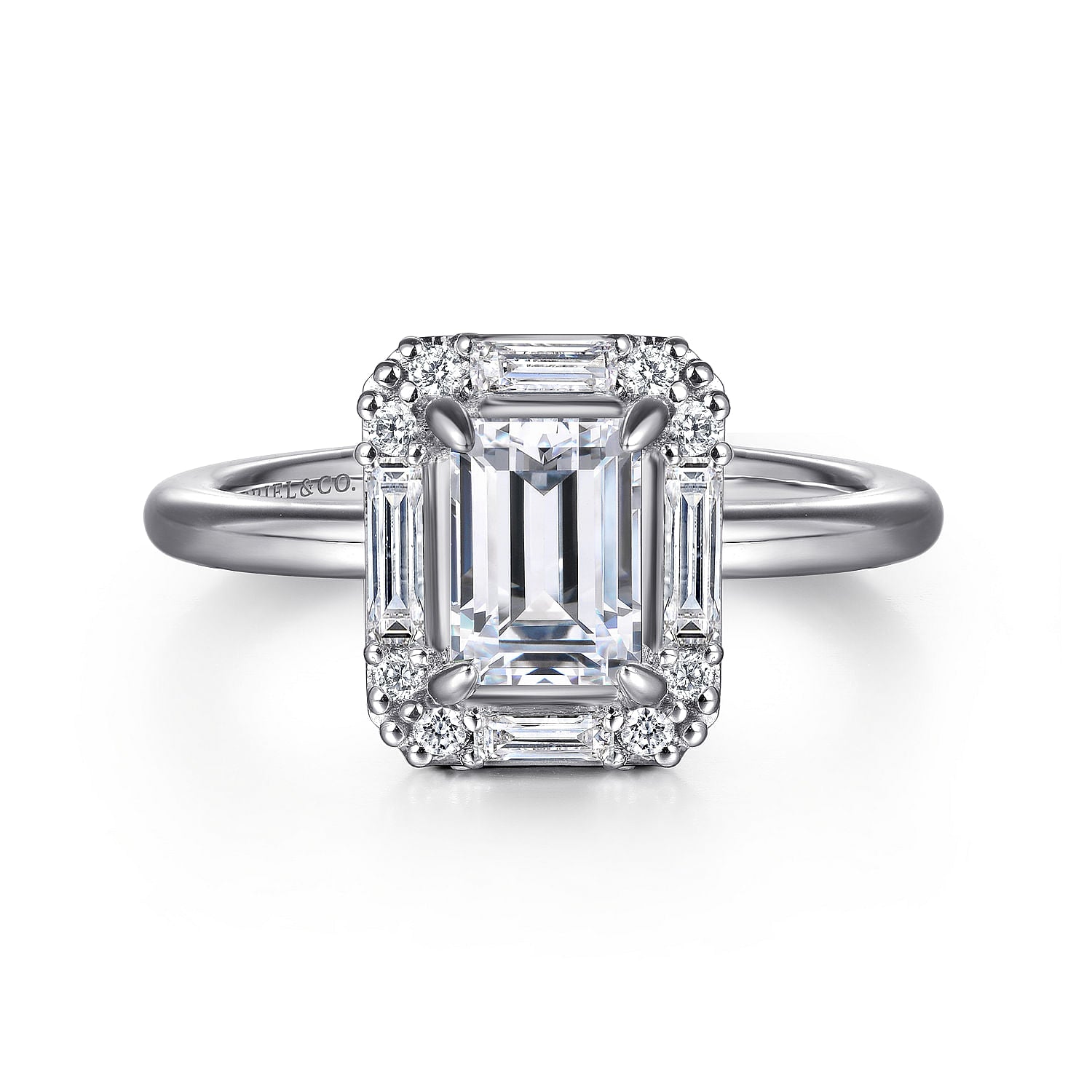 Art Deco 14K White Gold Halo Emerald Cut Diamond Engagement Ring