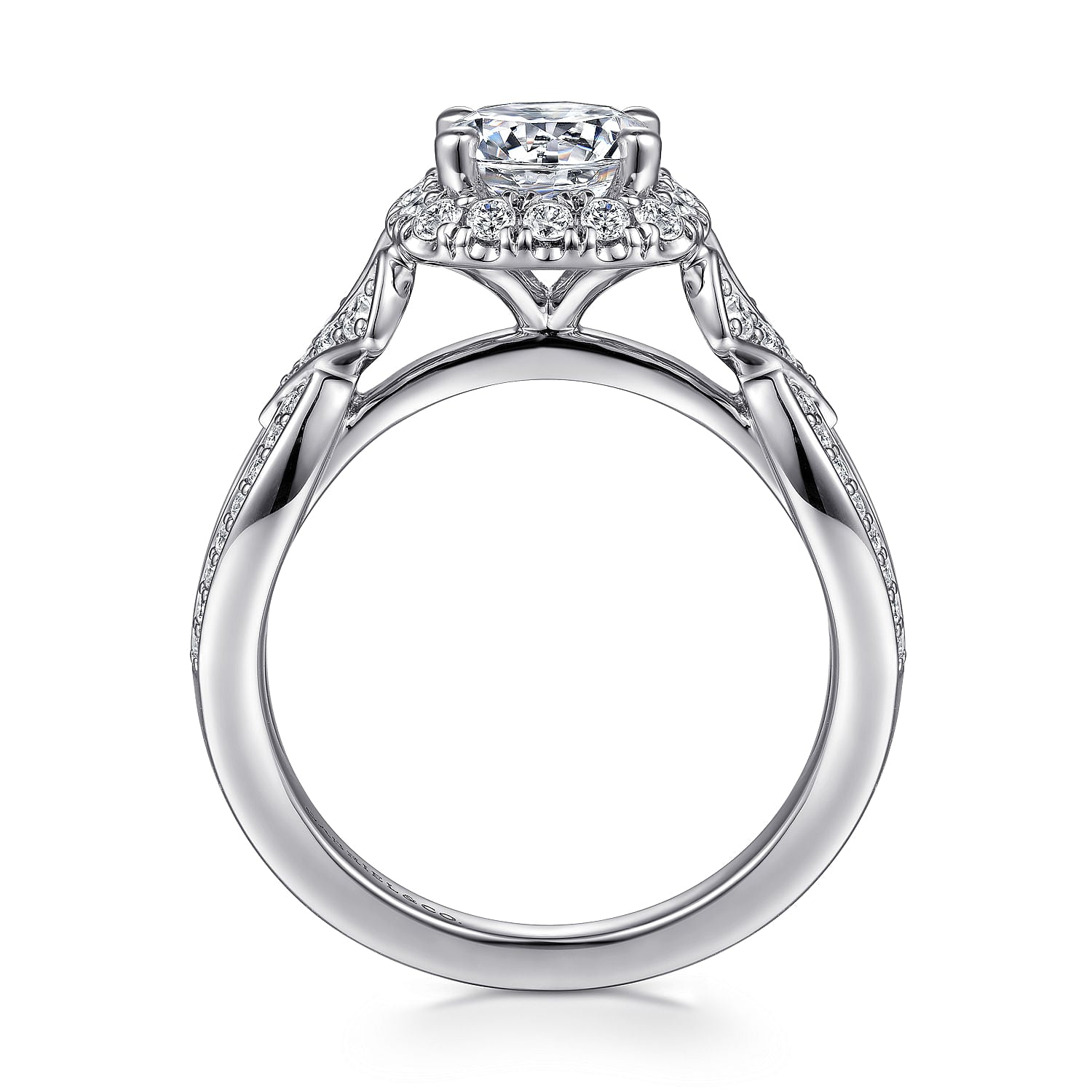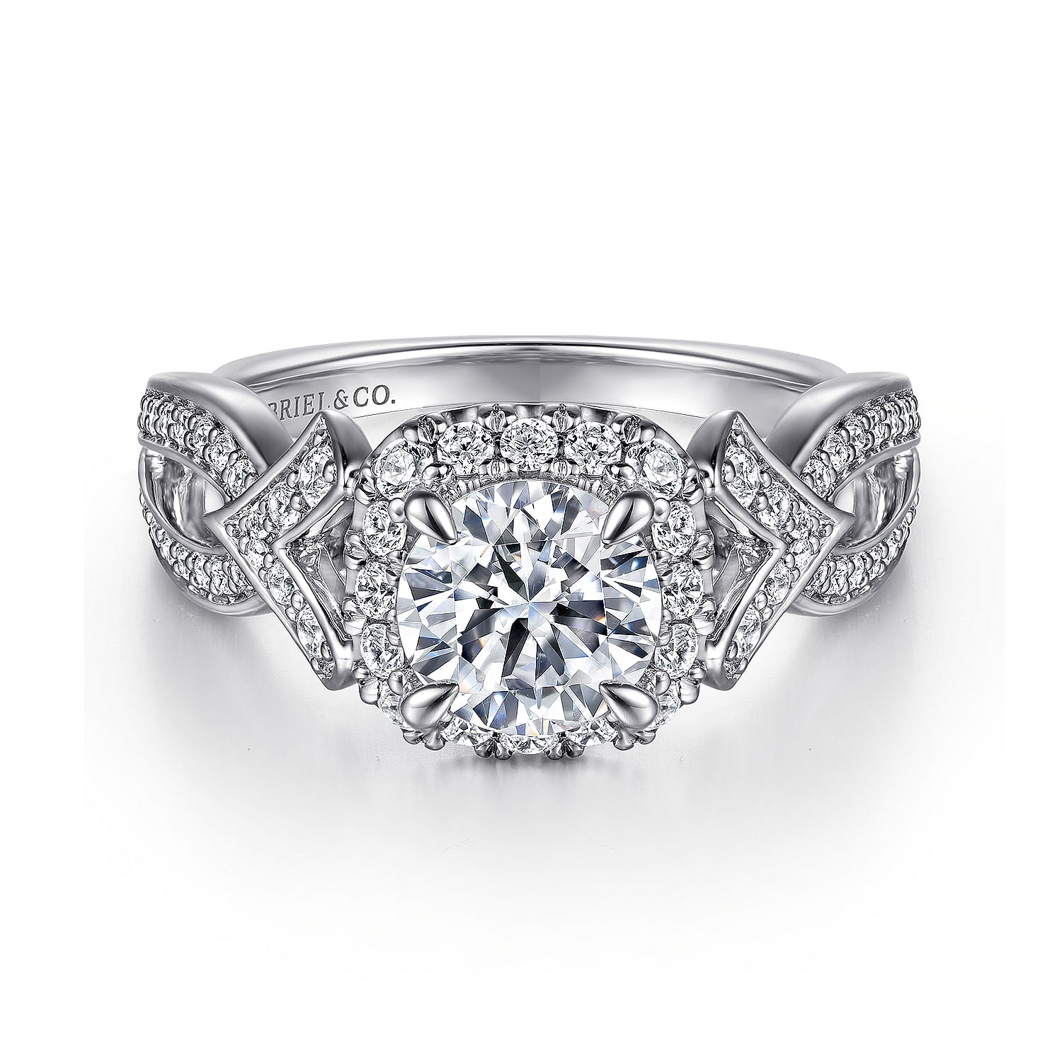 A captivating cushion cut halo crowns this Art Deco inspired engagement ring fashioned in 14K white gold. The classic cathedral design arches up toward your 1ct round center stone. Diamond detailing and sparkling chevrons on each shoulder of the split shank bring this setting to 0.47cts of diamonds.