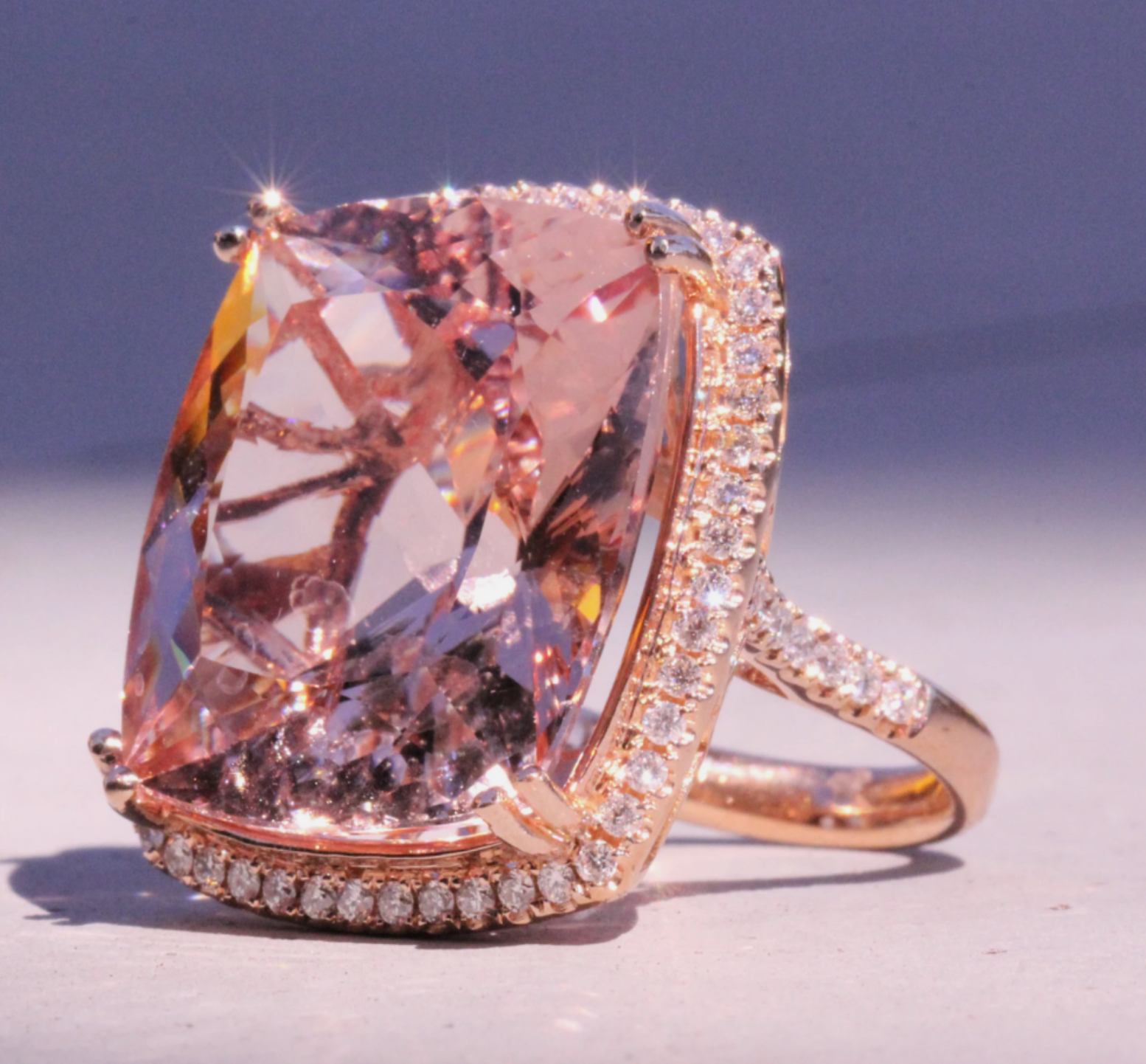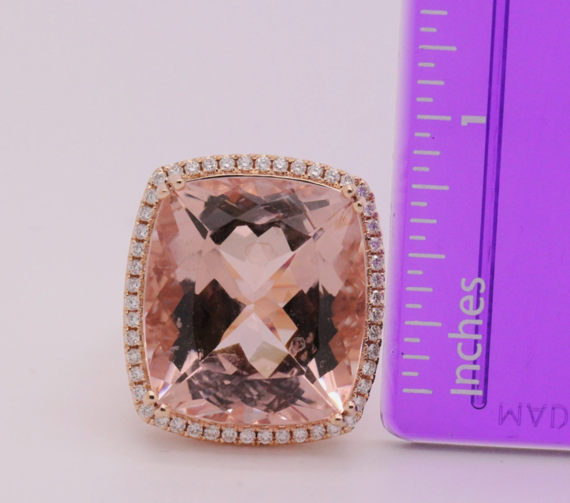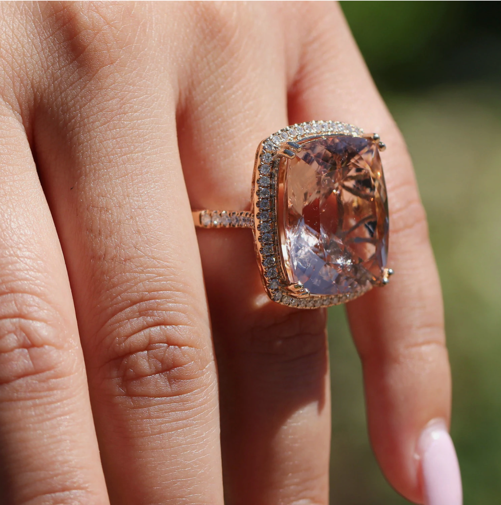 Big Cushion Shape Morganite 33.22 Carat Ring with a Diamond Halo, Fashion Ring