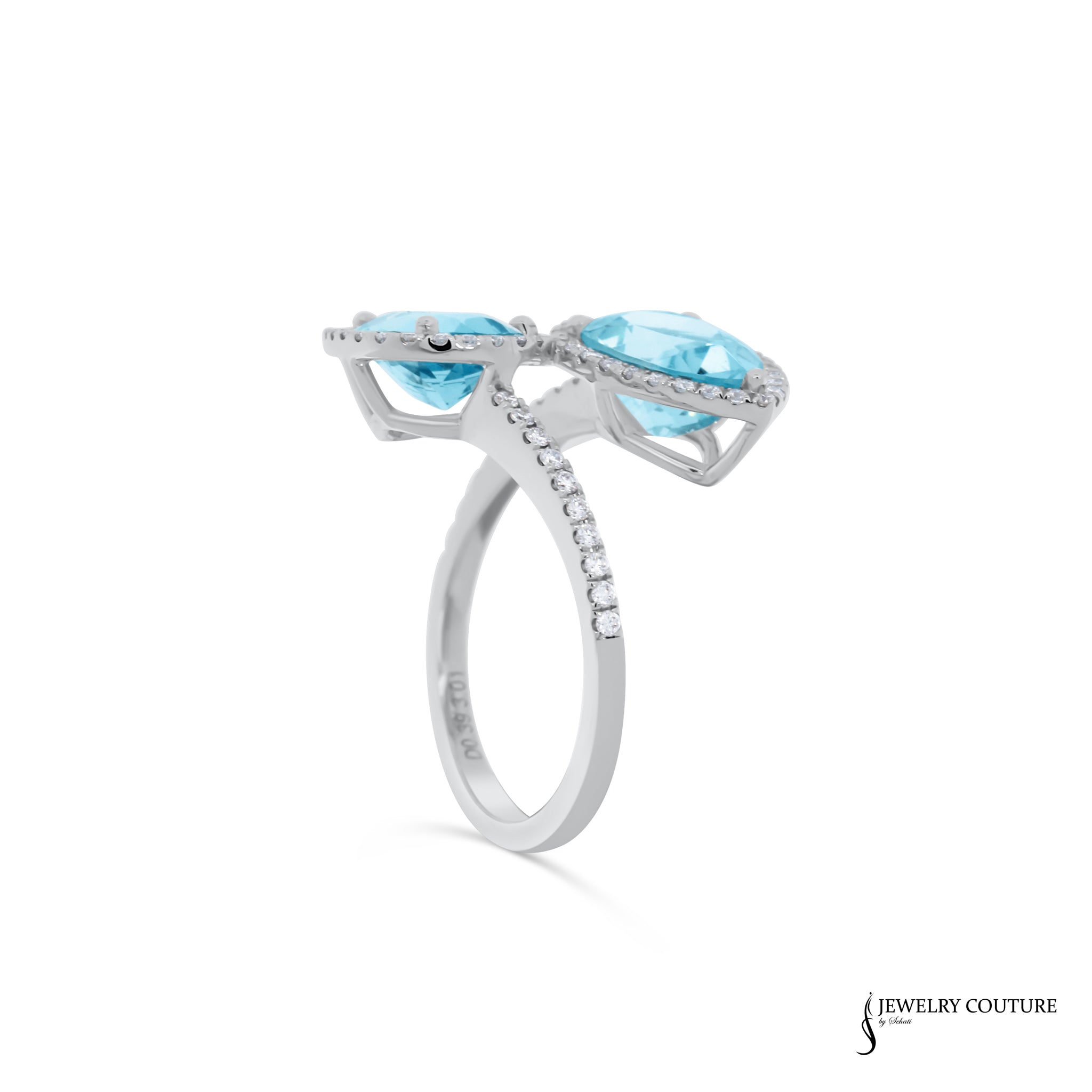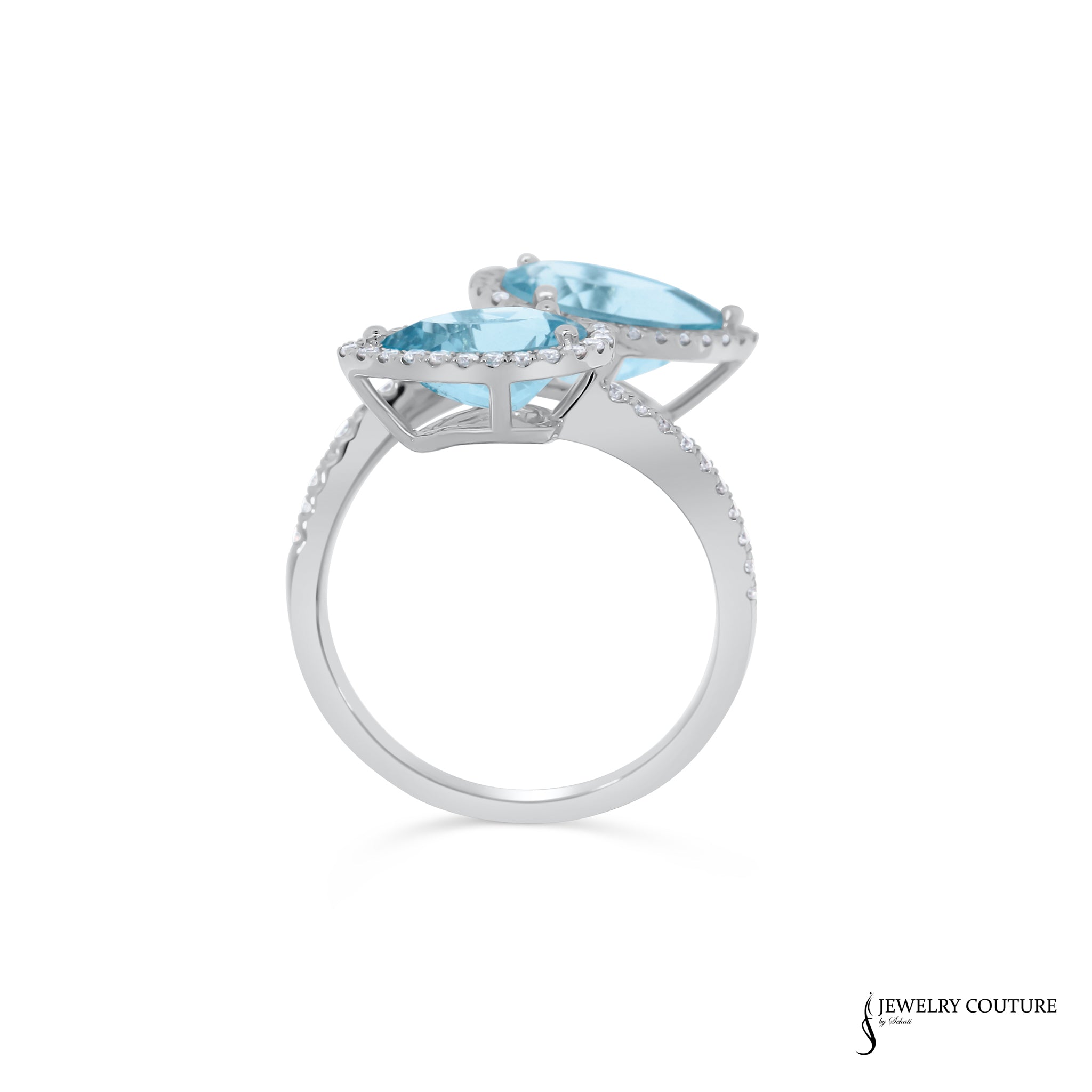 Designed to captivate, this aquamarine and diamond bypass ring is a perfect choice for those who appreciate timeless beauty with a unique touch.