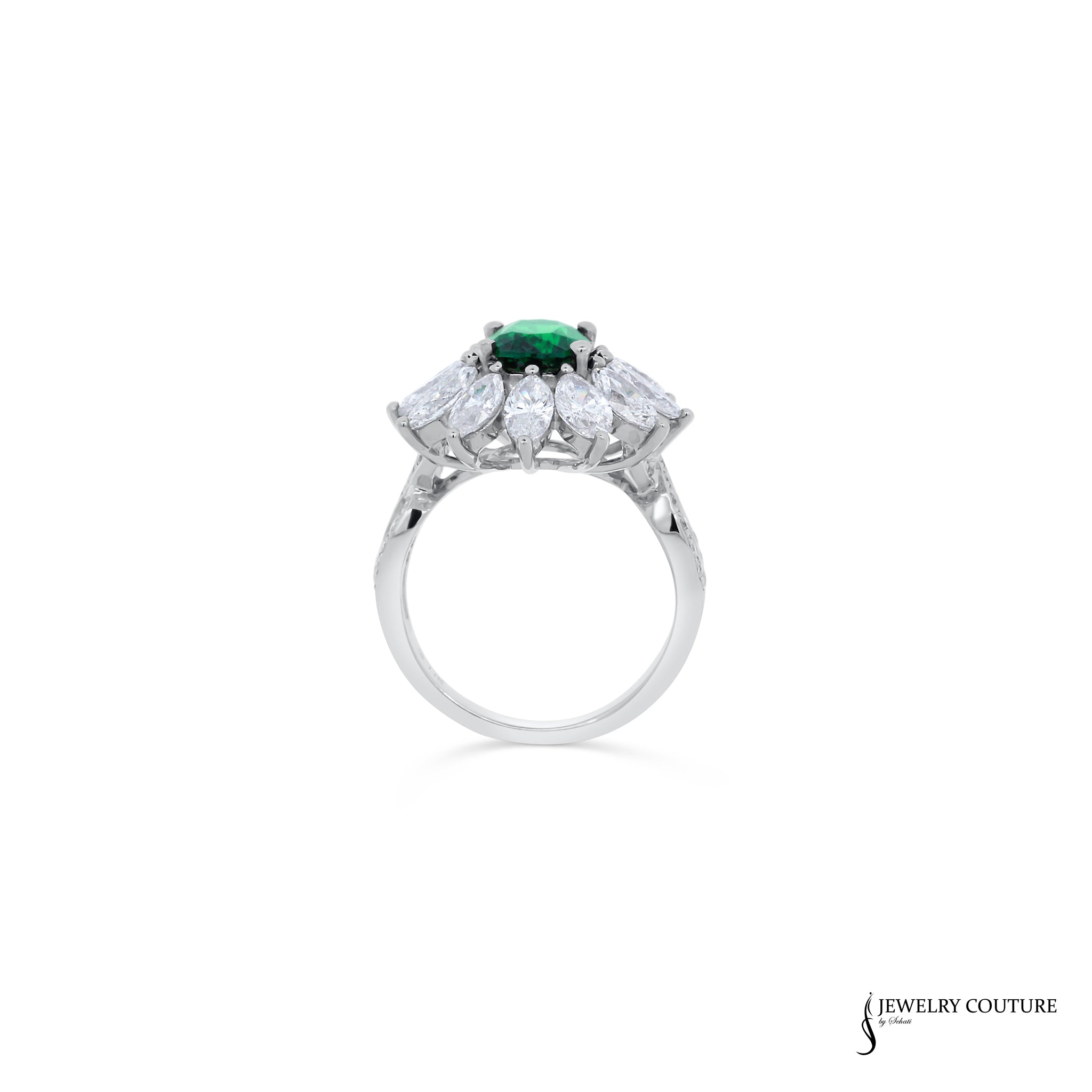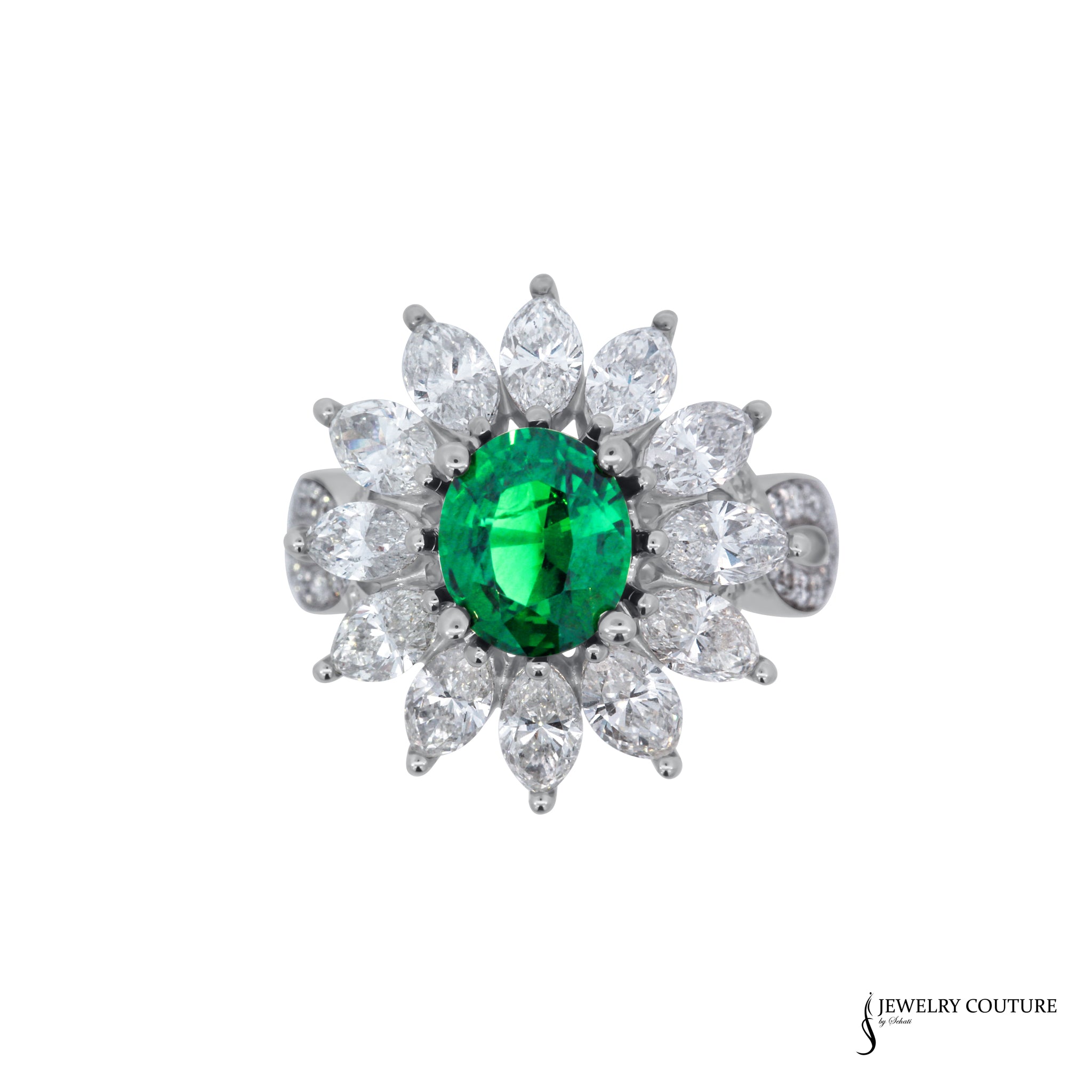 This dazzling Celosia ring, crafted from 14KT White Gold, boasts a stunning 1.84CT Tsavorite center stone and a halo of 3.23CT Diamonds. Its elegant design and vibrant green hues make it a perfect statement piece for any occasion.