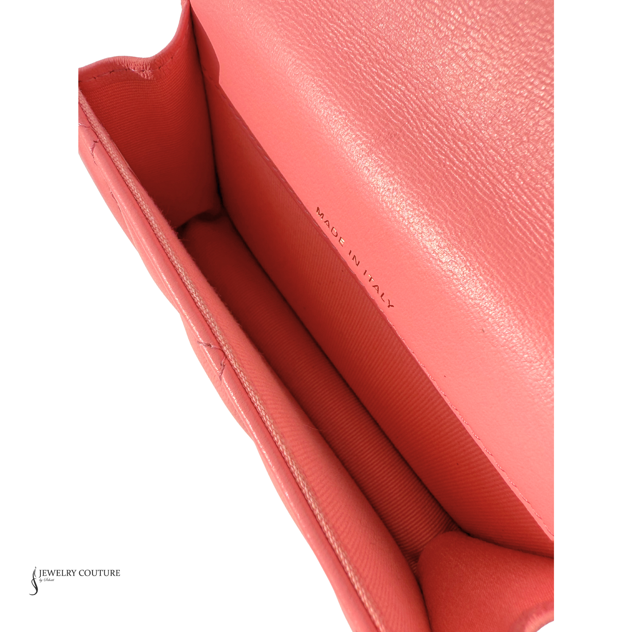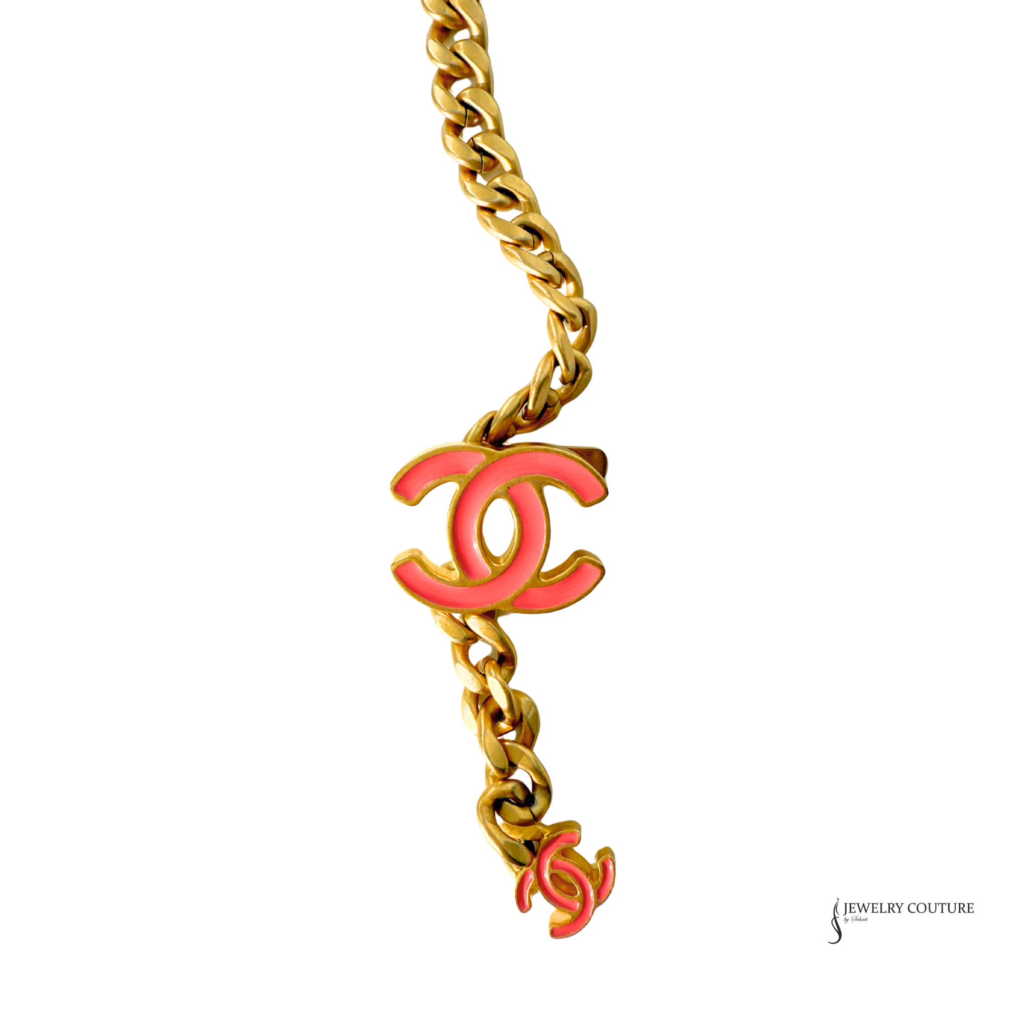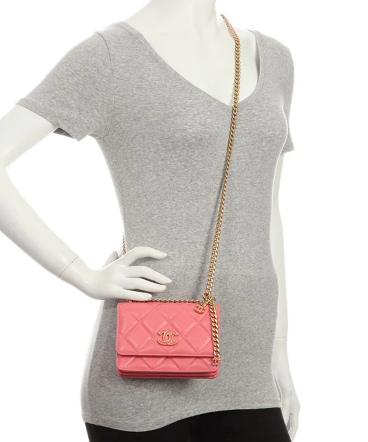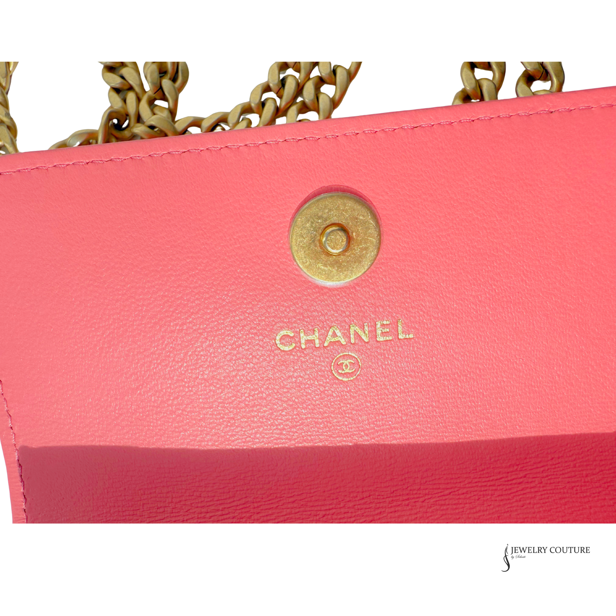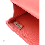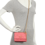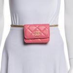 Chanel’s Pink Quilted Lambskin Pending CC Wallet on Chain WOC is a very cool tweak on the traditional style! It’s paired with antiqued gold-tone hardware and a chunky chain that can be use as a belt of as a crossbody. It has a pink enamel-inlaid CC logo on the magnetic flap that snaps closed and on the charm at the end of one of the dual hanging chain-link accents.