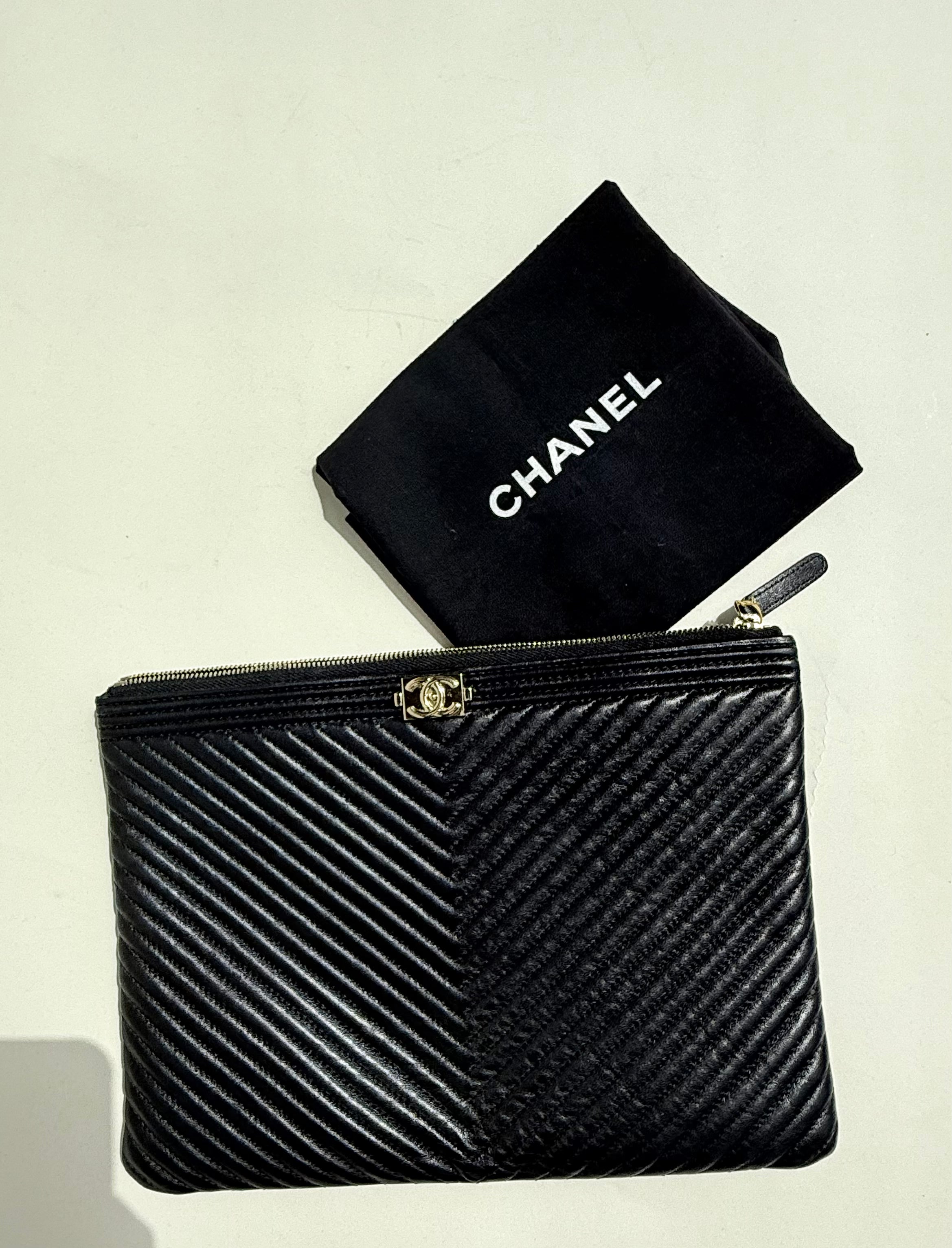 This is an authentic CHANEL Calfskin Chevron Medium Boy Cosmetic Case in Black. This extra-large sized stylish cosmetics case is crafted of padded chevron calfskin leather in black and features a linear quilted top border and an aged gold Chanel boy logo press lock. The top zipper opens to a chevron quilted black nylon interior.