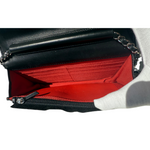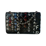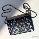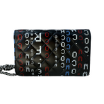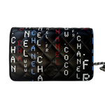 This is an authentic CHANEL Lambskin Quilted Data Center Wallet On Chain WOC in Black. This chic wallet on chain is crafted of diamond quilted lambskin leather in black with multicolored letters that spell Chanel and Coco. The wallet features a silver chain link leather threaded shoulder strap and a stitched CC logo on the flap. This opens with a snap to a red fabric interior with card slots, patch pockets and a zipper compartment. This splendid wallet is ideal for everyday use with the one of a kind style, from Chanel.