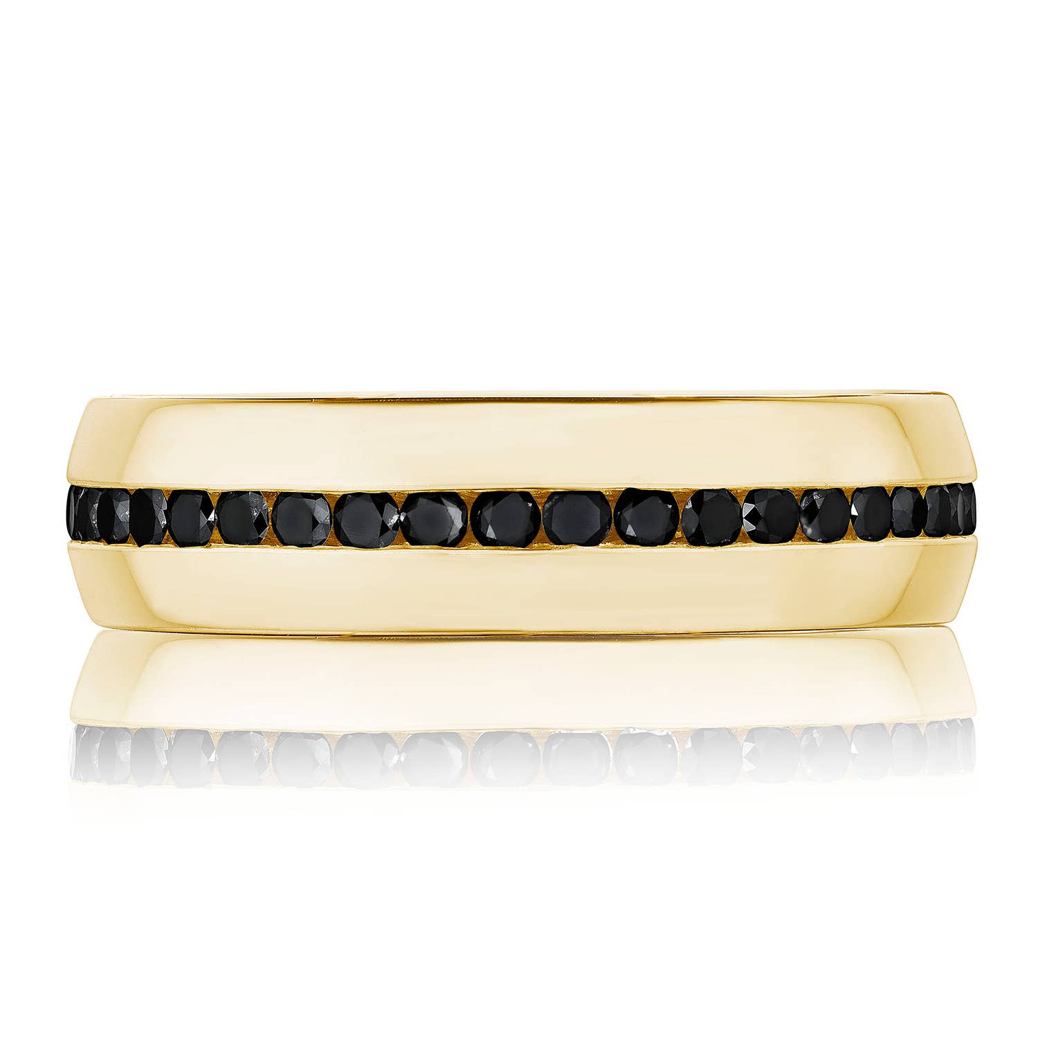 The high polish, softly-rounded exterior of this wedding band is encircled with eye-catching and expertly channel-set black diamonds. The inner face of the ring boasts a full sculpted crescent detail with a soft-comfort fit for all-day wearability.